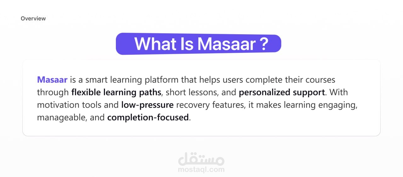 Masaar هي منصة تعليمية تعتمد على أسلوب التعلم المُحفَّز بالألعاب (Gamified Learning) وتهدف إلى زيادة تفاعل المستخدمين وتحسين معدلات إكمال الدورات. الفكرة الأساسية من المنصة هي تحويل تجربة التعلم من مجرد مشاهدة دروس بشكل تقليدي إلى رحلة تعليمية تفاعلية ومحفزة.