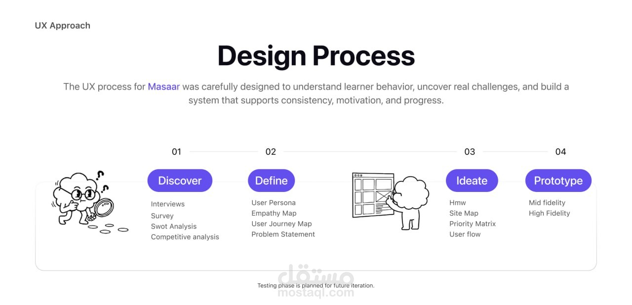 يشمل المشروع مراحل عملية تصميم تجربة المستخدم (UX Process) مثل: