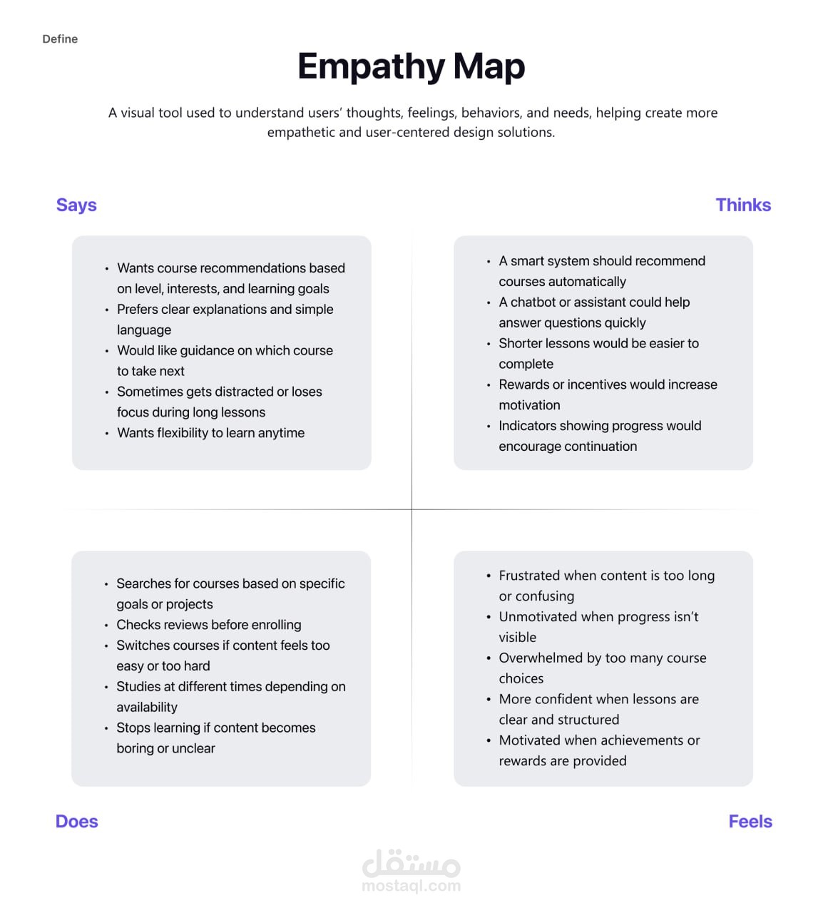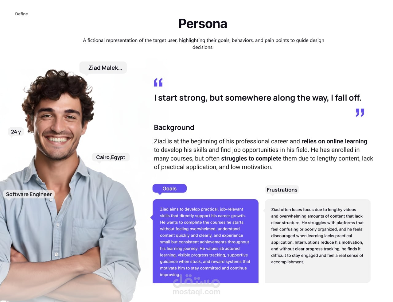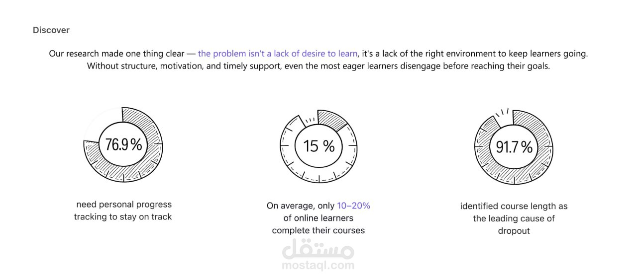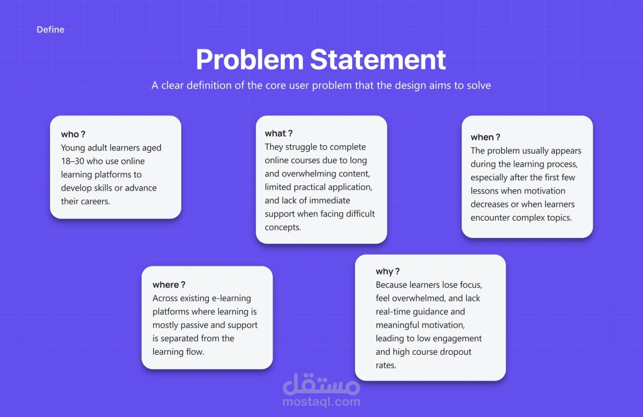 في دراسة الحالة هذه، قمت باستكشاف تجربة المستخدم الكاملة بداية من مرحلة البحث وفهم احتياجات المستخدمين، مرورًا بتحديد المشكلات التي تواجه المتعلمين في المنصات التقليدية مثل انخفاض التفاعل وصعوبة الاستمرار في الدورات، ثم العمل على تقديم حلول تصميمية تساعد على جعل التعلم أكثر تنظيمًا وتحفيزًا.