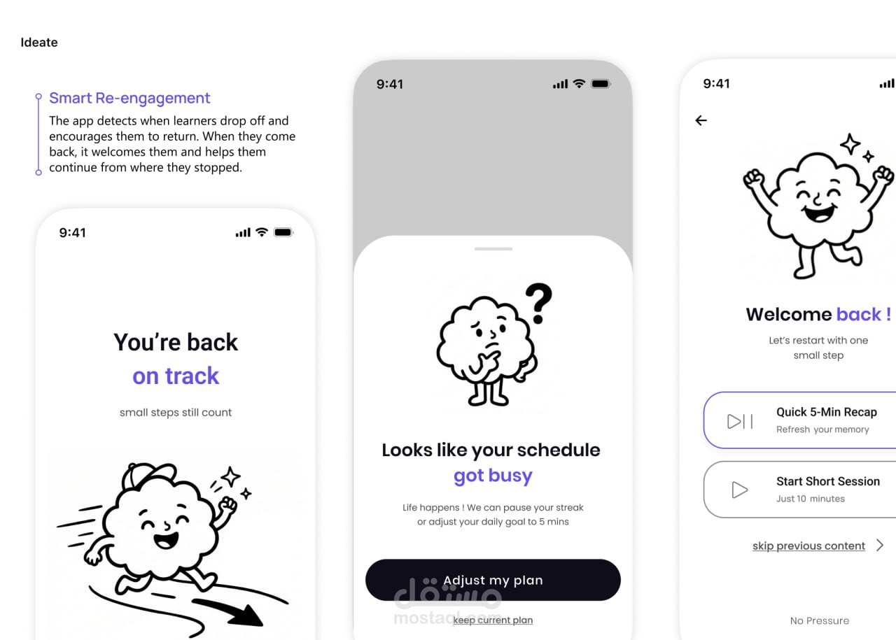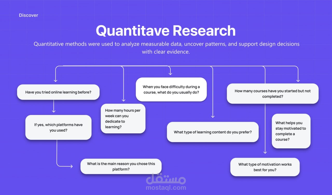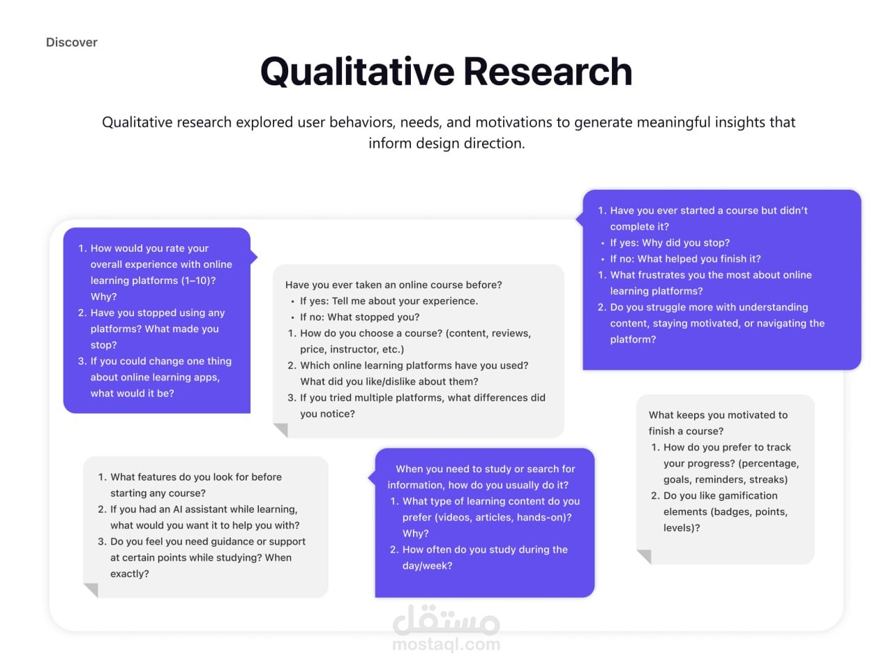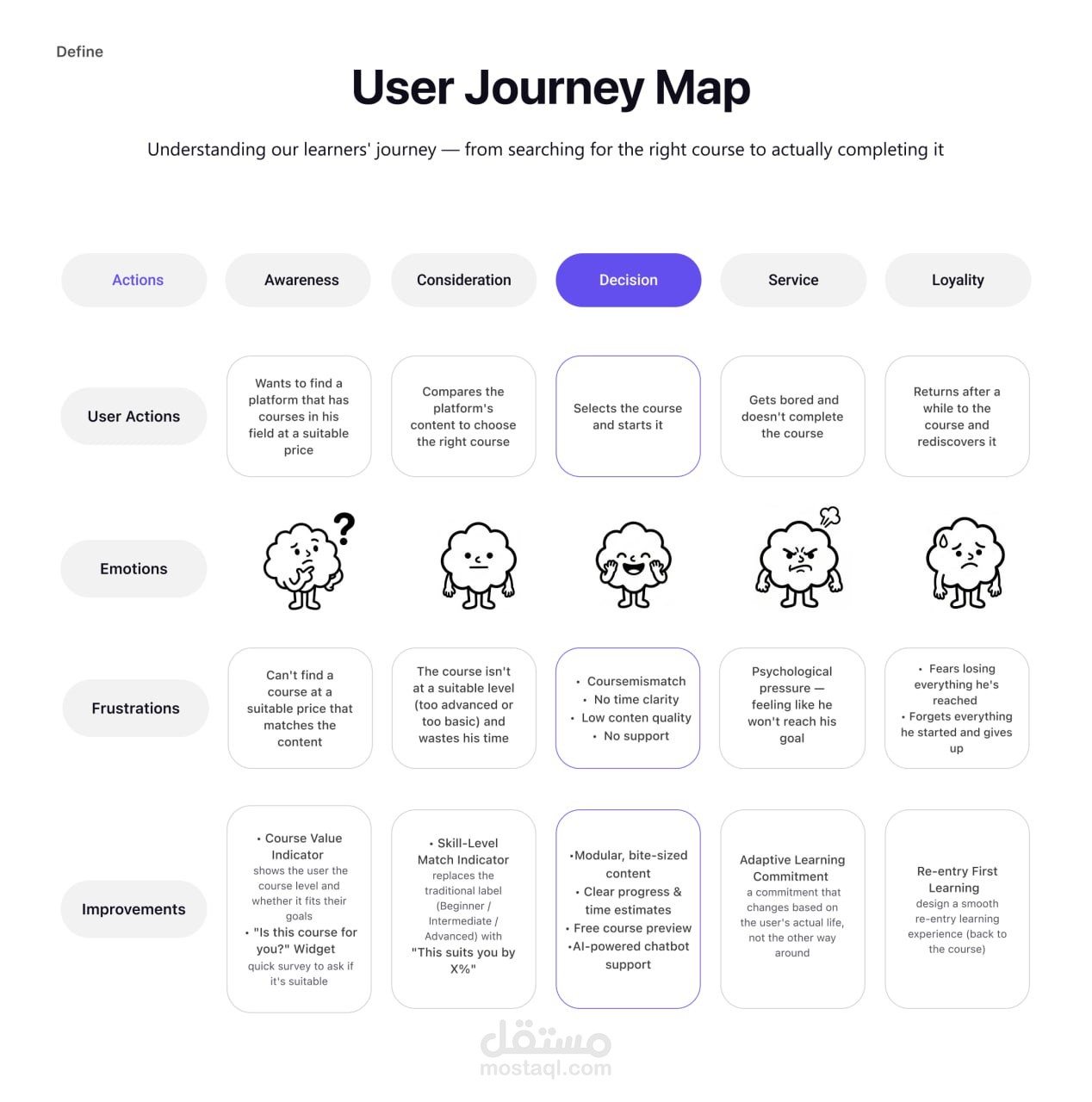 في دراسة الحالة هذه، قمت باستكشاف تجربة المستخدم الكاملة بداية من مرحلة البحث وفهم احتياجات المستخدمين، مرورًا بتحديد المشكلات التي تواجه المتعلمين في المنصات التقليدية مثل انخفاض التفاعل وصعوبة الاستمرار في الدورات، ثم العمل على تقديم حلول تصميمية تساعد على جعل التعلم أكثر تنظيمًا وتحفيزًا.
