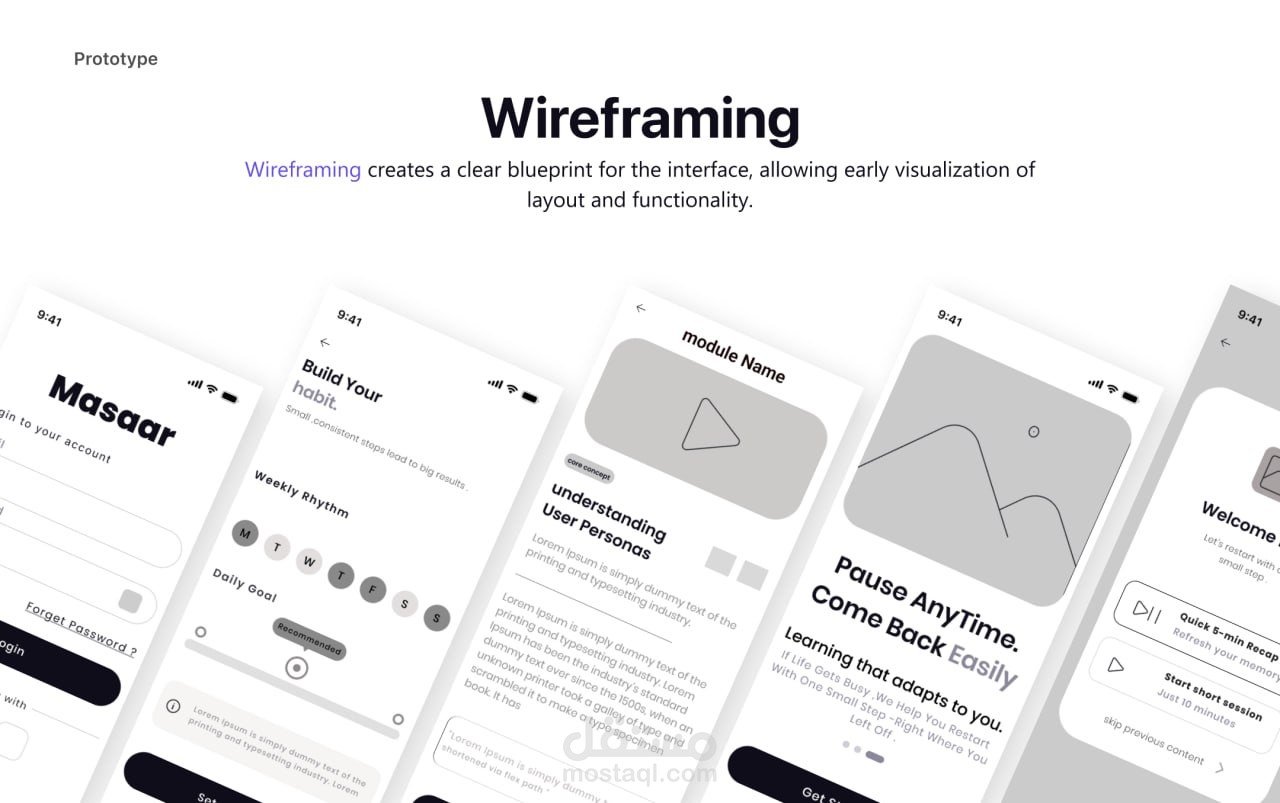 * إنشاء Wireframes لتنظيم المحتوى والواجهات.