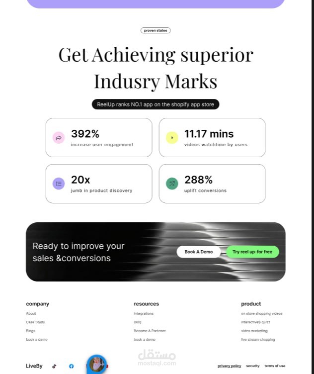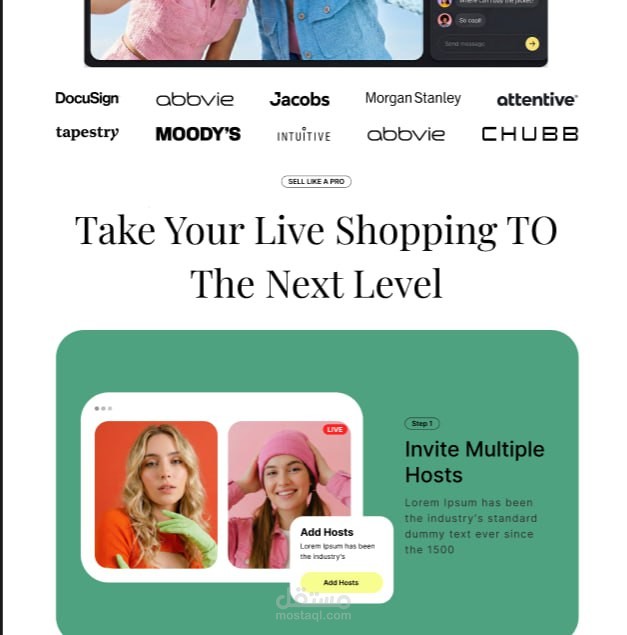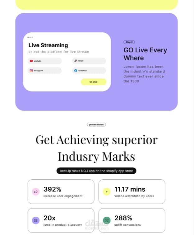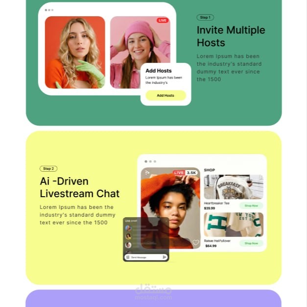 قمت بتطبيق خطوات التصميم بنفسي، بداية من تنظيم الأقسام وبناء الـ Layout وحتى تصميم الواجهة النهائية للـ Landing Page الخاصة بتطبيق Live Shopping.