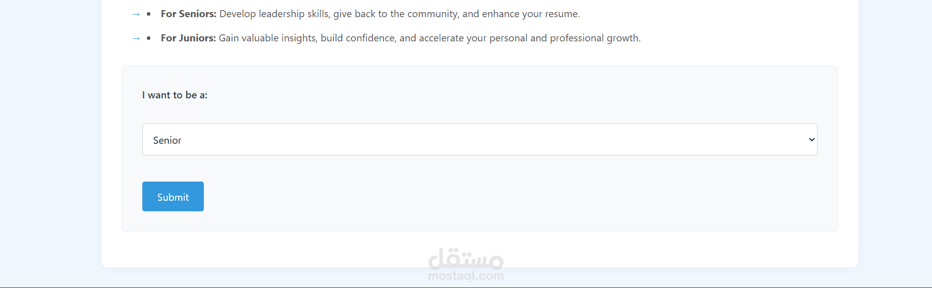 واجهة اختيار الأدوار: تتيح المنصة للمستخدم اختيار الدور الذي يرغب فيه (Senior أو Junior) عبر قائمة منسدلة بسيطة قبل تقديم الطلب.