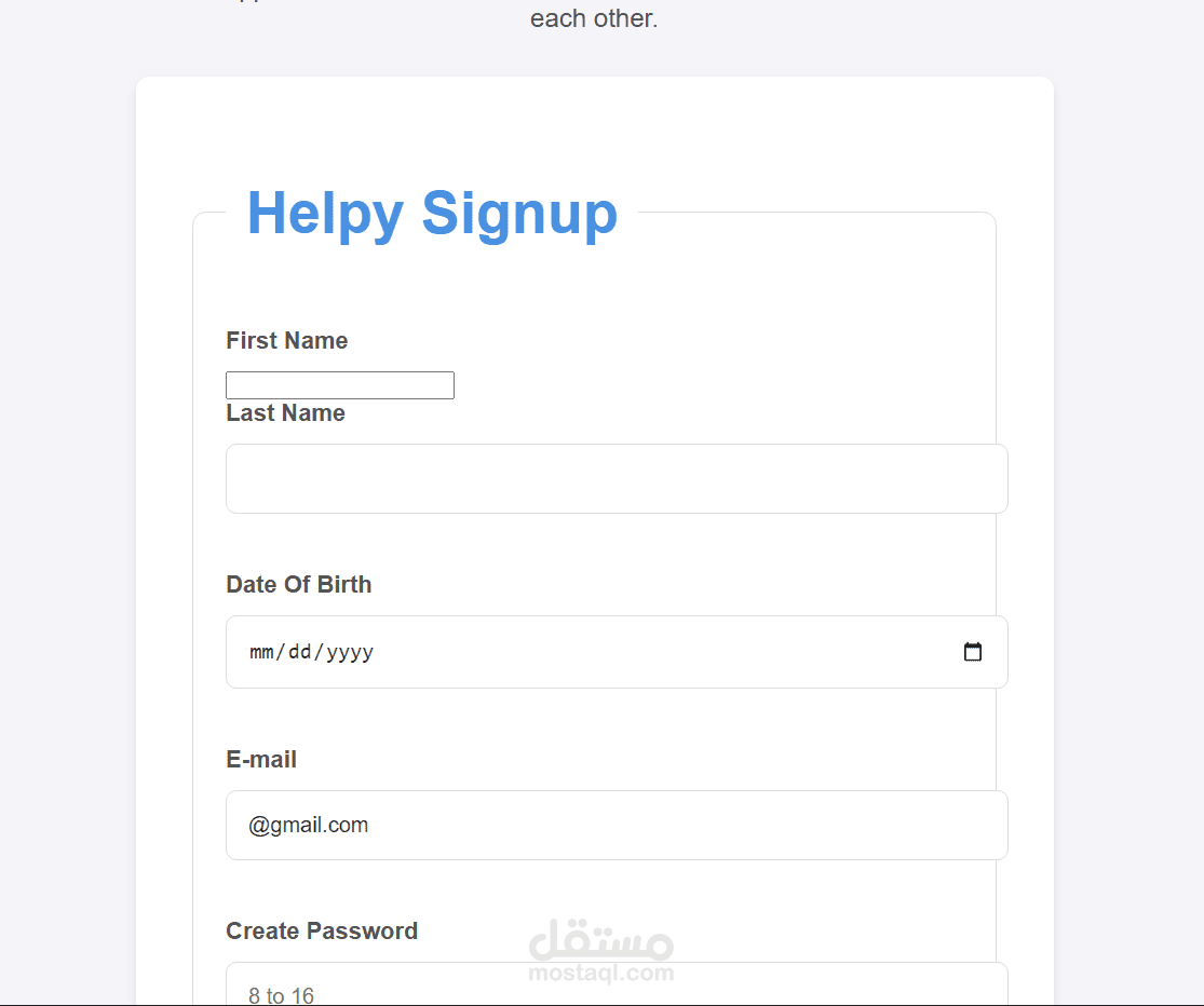 نظام التسجيل: يتضمن الموقع صفحة "Helpy Signup" لجمع بيانات المستخدمين مثل الاسم، تاريخ الميلاد، والبريد الإلكتروني.