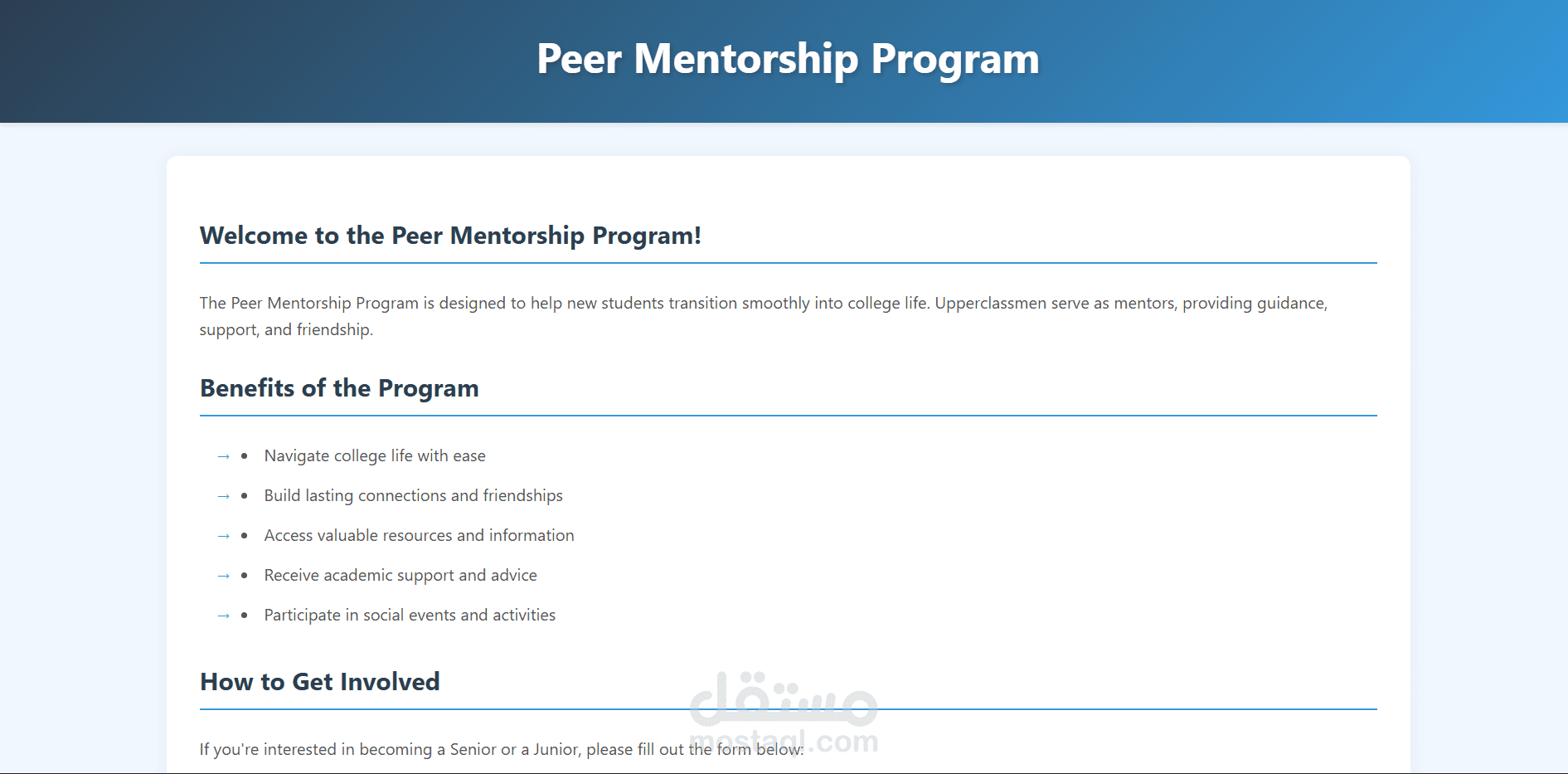 هذا الجزء من المشروع عبارة عن منصة ويب تهدف إلى تسهيل التواصل بين الطلاب من خلال "برنامج الإرشاد الأقران" (Peer Mentorship Program). صُممت المنصة لمساعدة الطلاب الجدد على الانتقال بسلاسة إلى الحياة الجامعية من خلال ربطهم بطلاب أكبر سناً (Upperclassmen) يقدمون لهم التوجيه والصداقة.