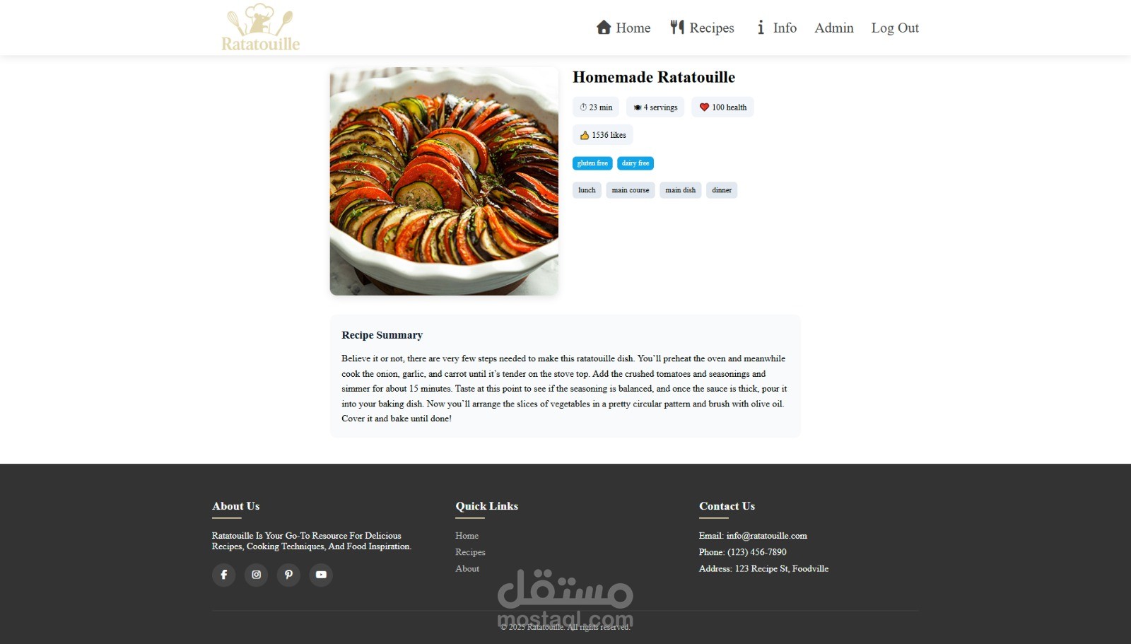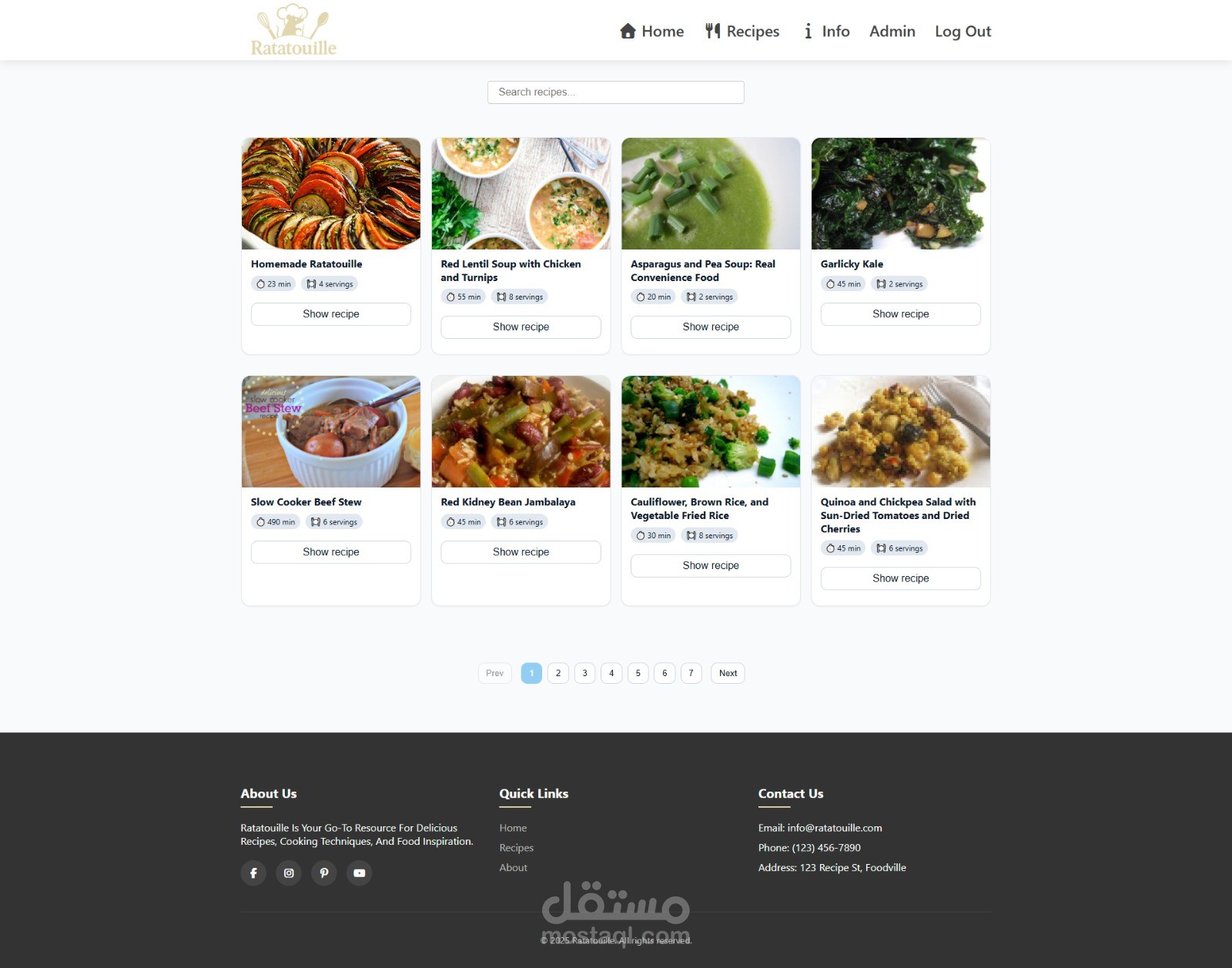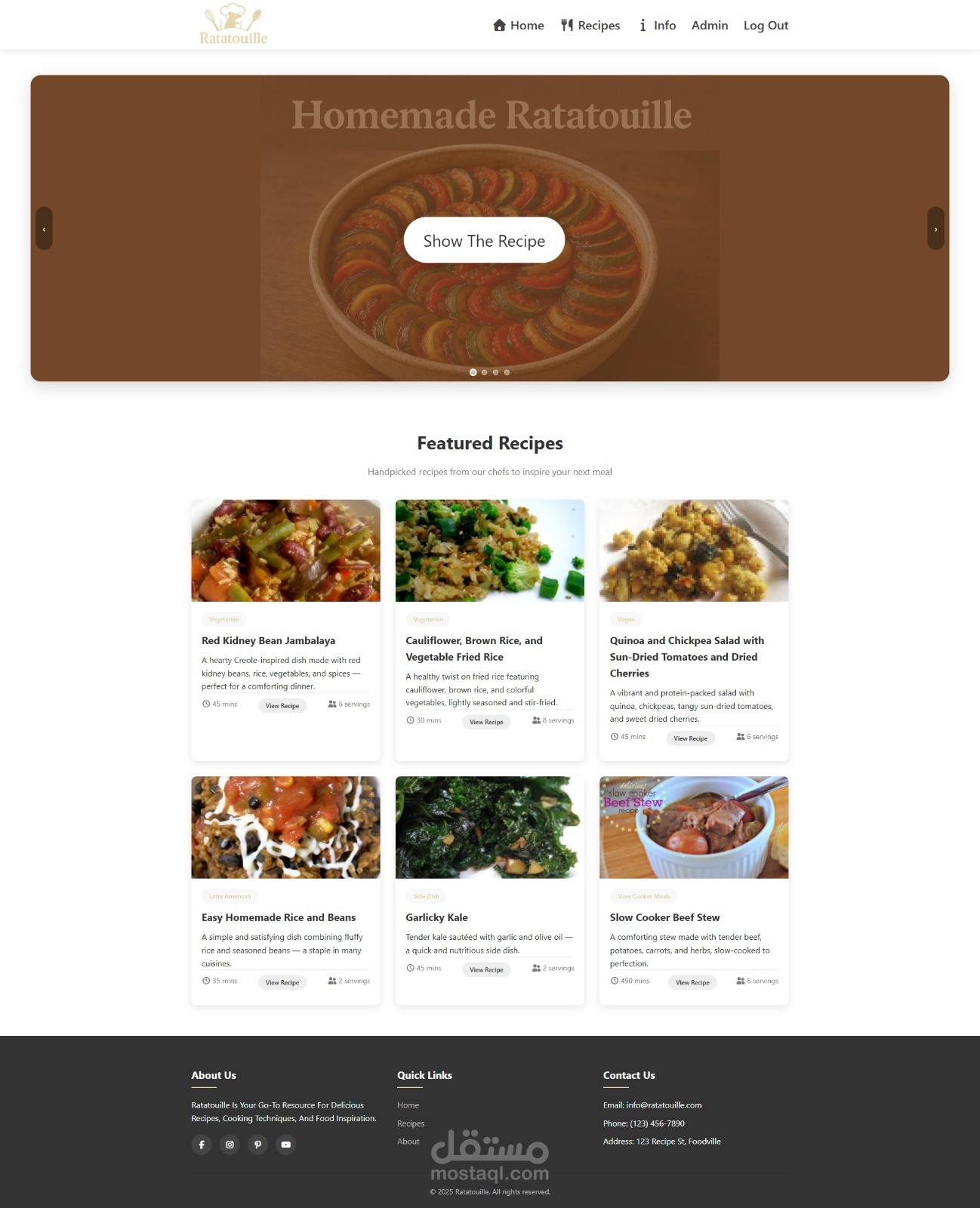 موقع Ratatouille هو منصة ويب متطورة مخصصة لاستعراض وإدارة وصفات الطعام، تم بناؤه ليكون نموذجاً للمواقع التفاعلية التي تجمع بين التصميم العصري والأداء السلس. يهدف المشروع إلى تقديم تجربة مستخدم متكاملة تتيح تصفح المحتوى وإدارة البيانات بكفاءة عالية.