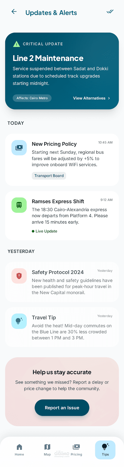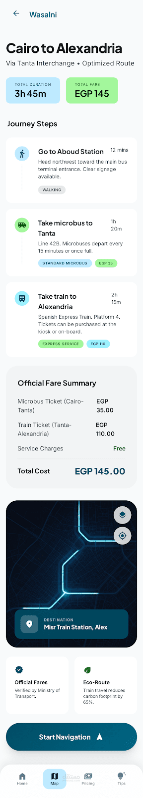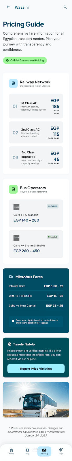 التسلسل الهرمي: يبدأ التصميم بشعار رسمي ("أسعار حكومية رسمية") لتعزيز ثقة المستخدم، يليه عرض الفئات من الأكبر (القطارات) إلى الأكثر تفصيلاً (الميكروباص).