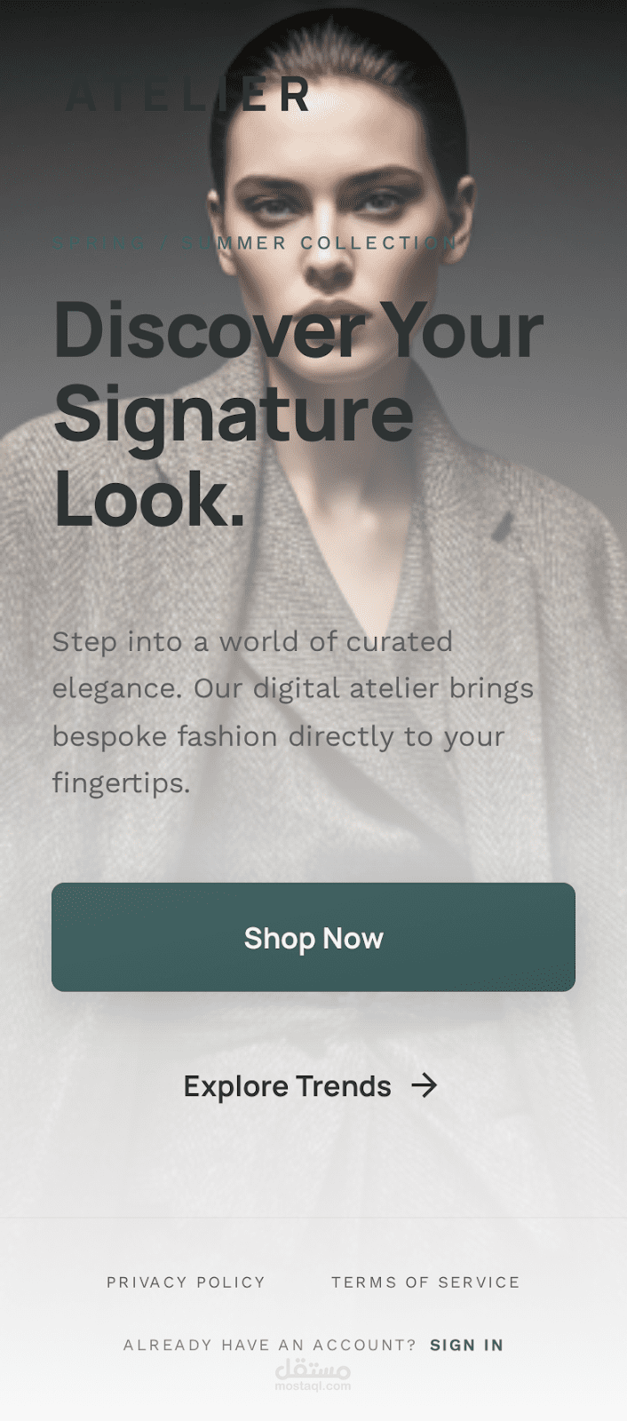 نظام الألوان: يعتمد التصميم على مزيج من اللون الأخضر الفاتح (لإعطاء إيحاء بالرسمية والأمان)، والأزرق الداكن (Petrol Blue) للتباين والاحترافية.