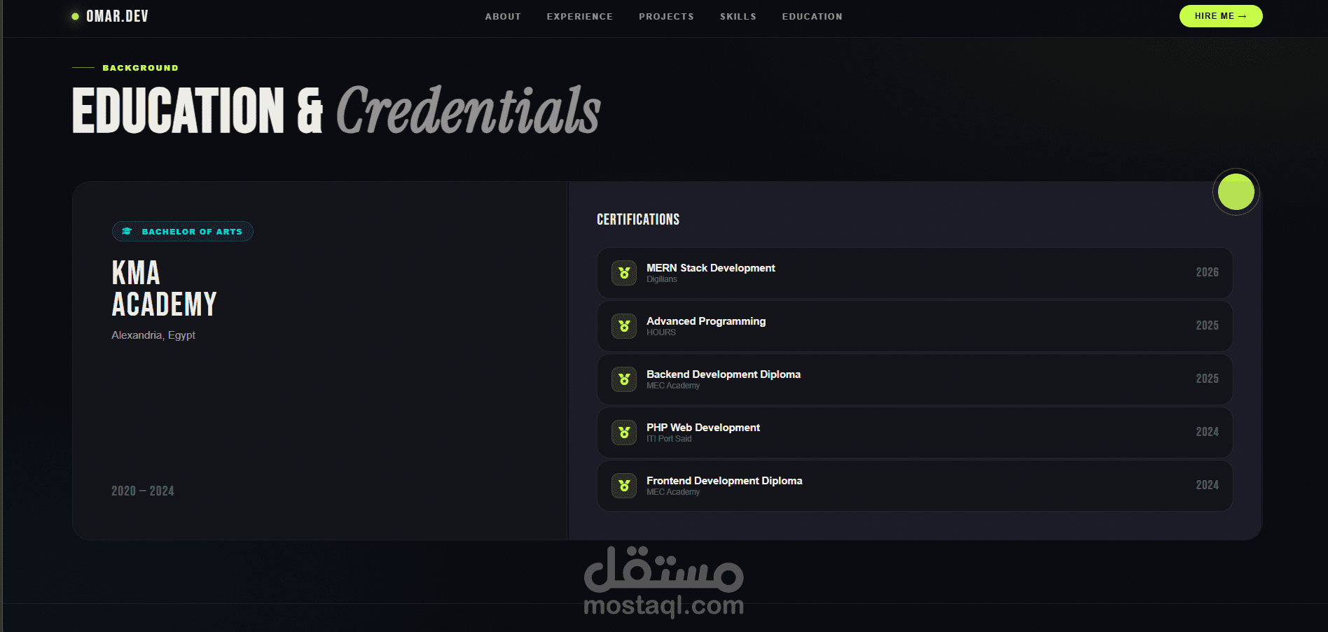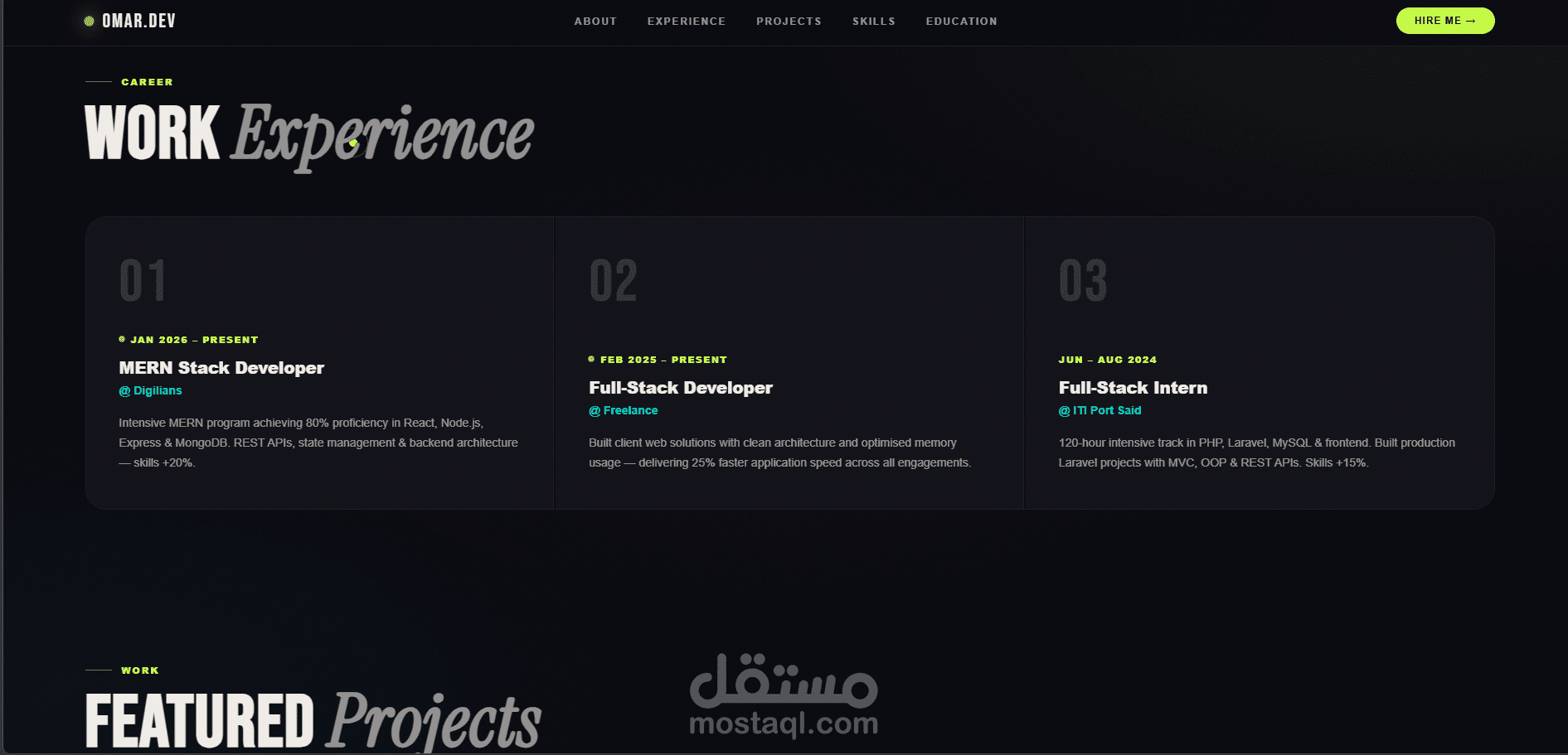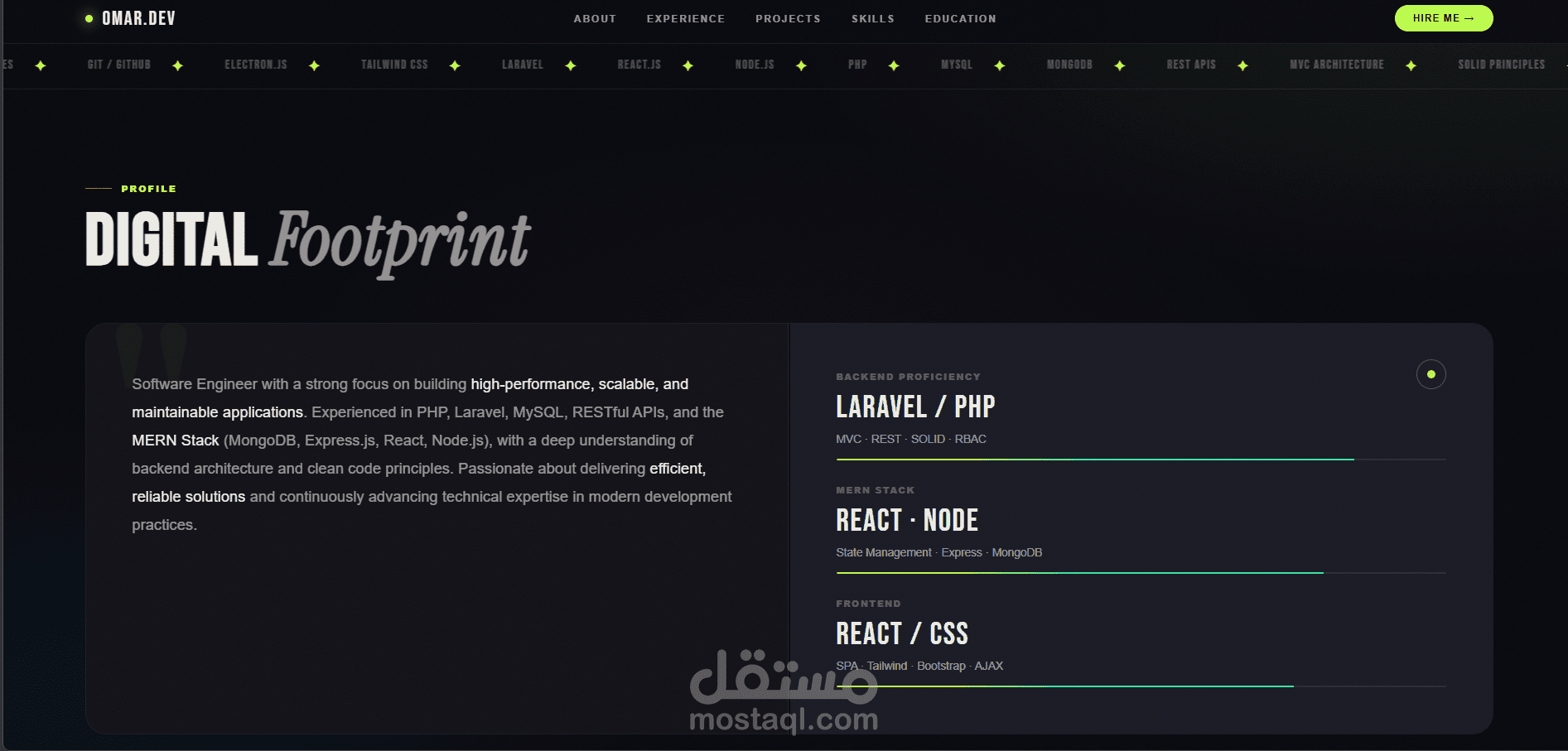 موقع شخصي احترافي تم تطويره لعرض المهارات التقنية والمشاريع البرمجية بطريقة منظمة وجذابة. يتيح الموقع للزوار التعرف على خبراتي في تطوير الويب، واستعراض المشاريع التي قمت بتنفيذها، بالإضافة إلى إمكانية التواصل المباشر. تم تصميم الموقع بواجهة Responsive لتعمل بكفاءة على مختلف الأجهزة والشاشات، مع التركيز على تجربة المستخدم وسرعة الأداء.