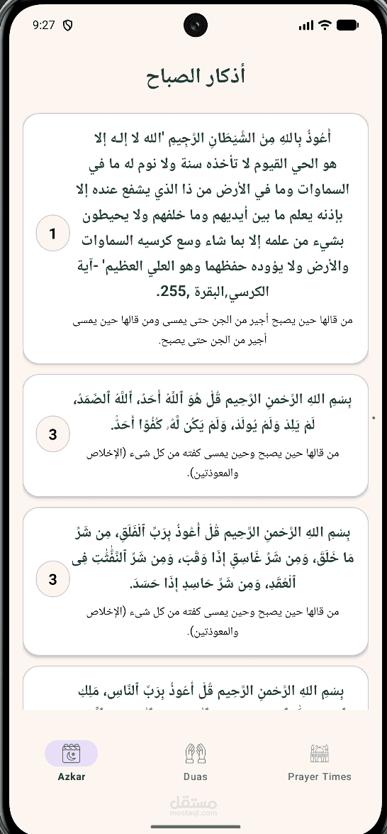 أذكار وأدعية مرتبة ومقسمة حسب اليوم والوقت: سهولة الوصول للذكر اليومي تجعل الحفاظ على الأذكار عادة يومية ممتعة.