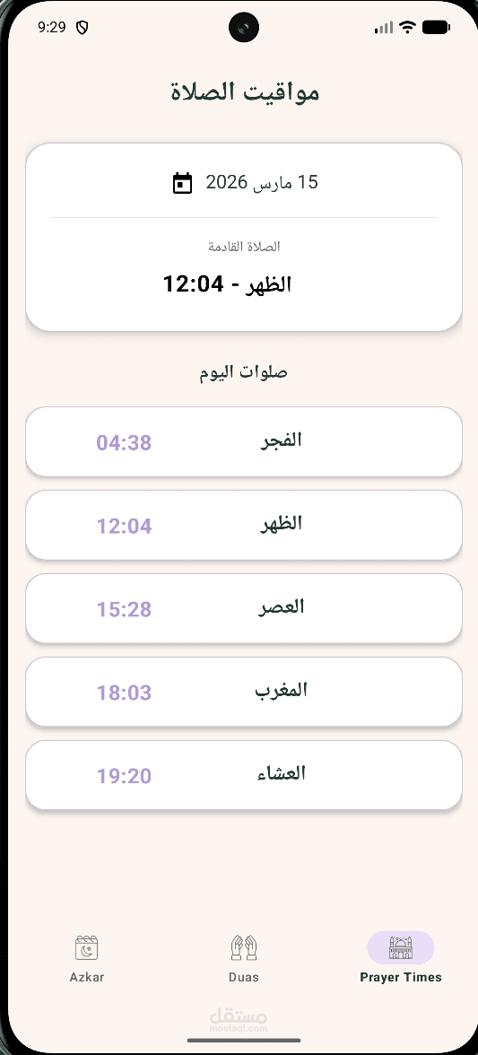 مواقيت الصلاة دقيقة ومحدثة باستمرار: من الفجر حتى العشاء، مع تحديث تلقائي حسب موقعك الجغرافي لضمان الالتزام بأوقات الصلاة الصحيحة.