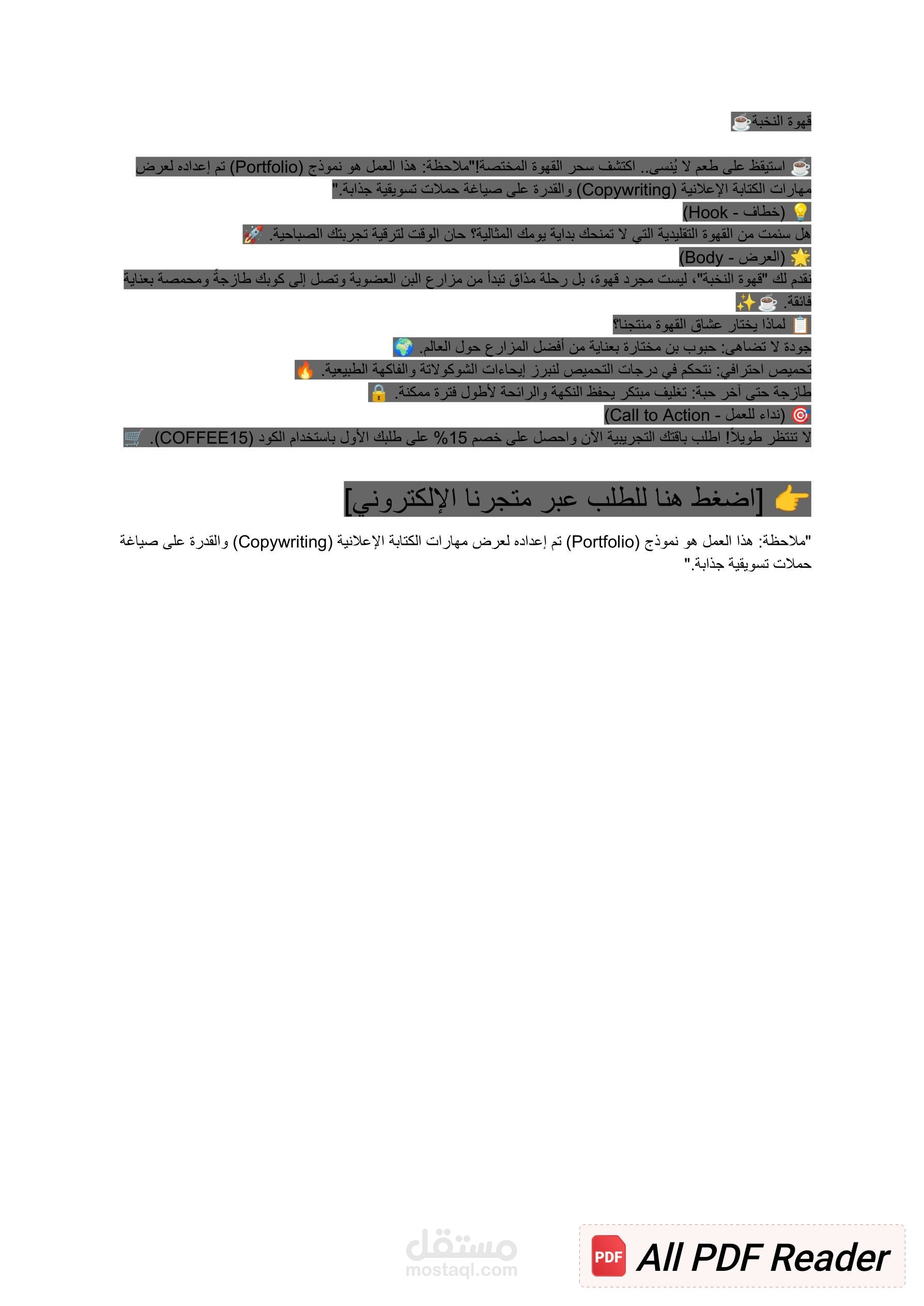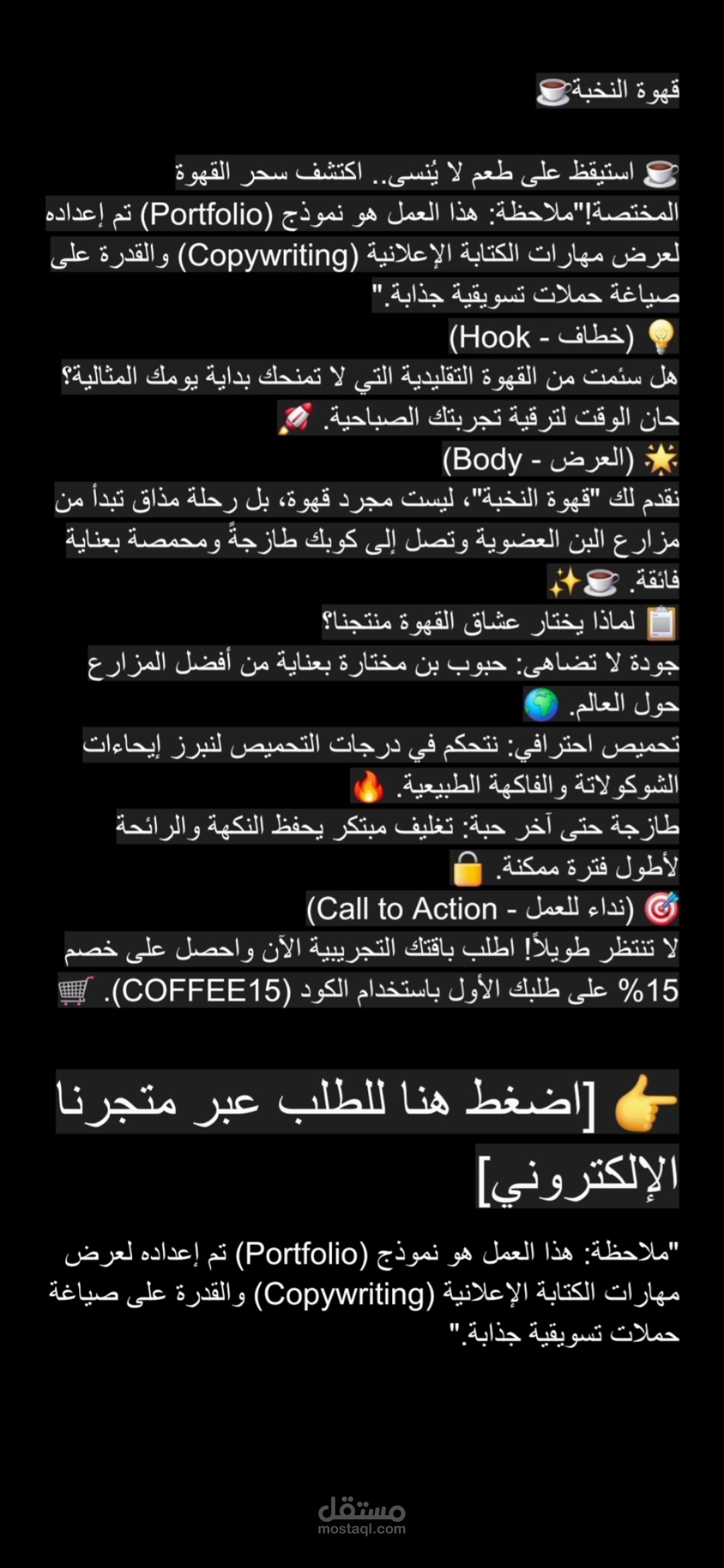 نموذج لحملة تسويقية إبداعية (Copywriting) لمنتج قهوة مختصة. يعتمد النص على استراتيجية تسويقية متكاملة تبدأ بـ (Hook) لجذب الانتباه، وعرض (Body) للمزايا التنافسية، وتنتهي بـ (Call to Action) لتحفيز العميل على الشراء مع إضافة عرض ترويجي.