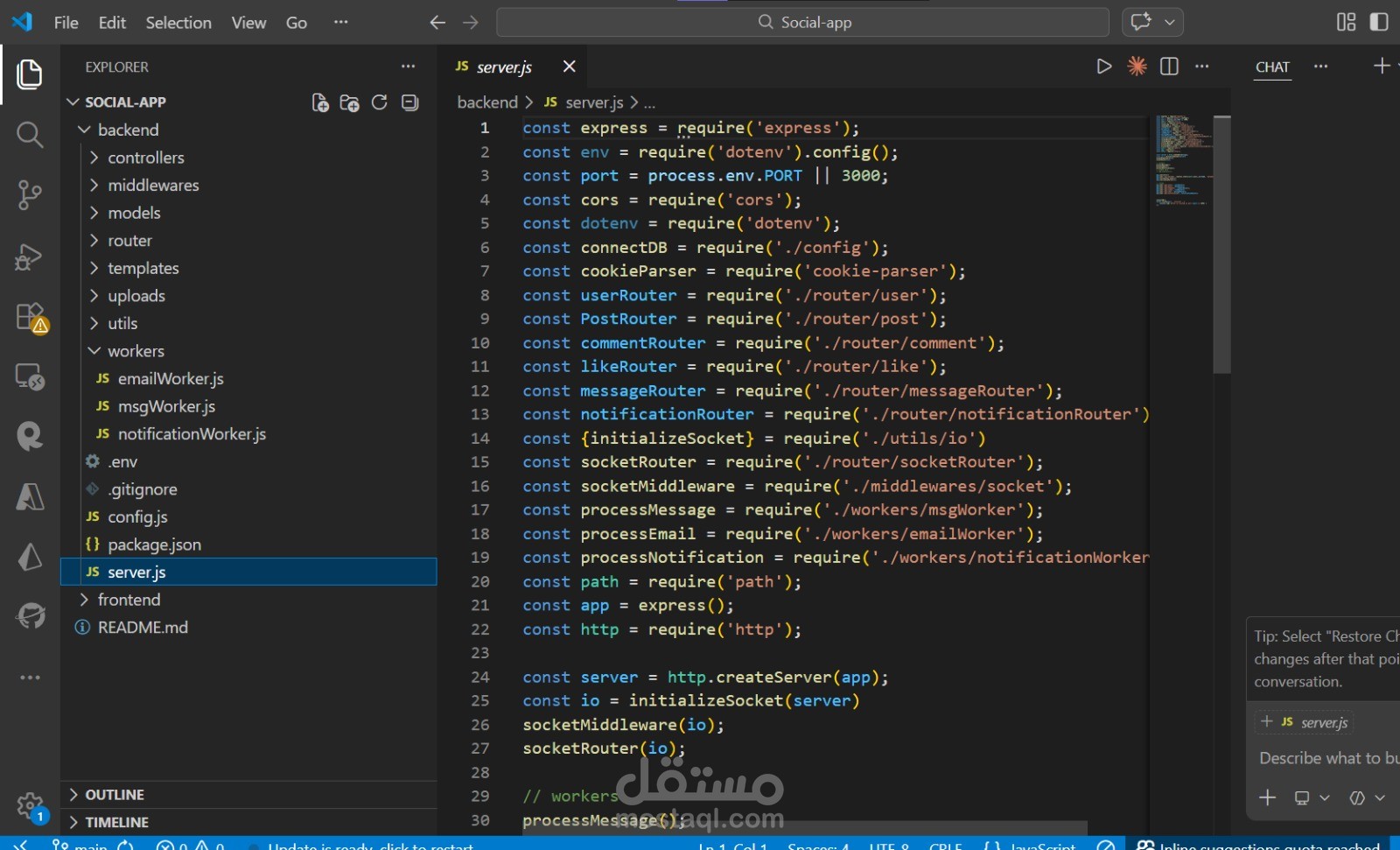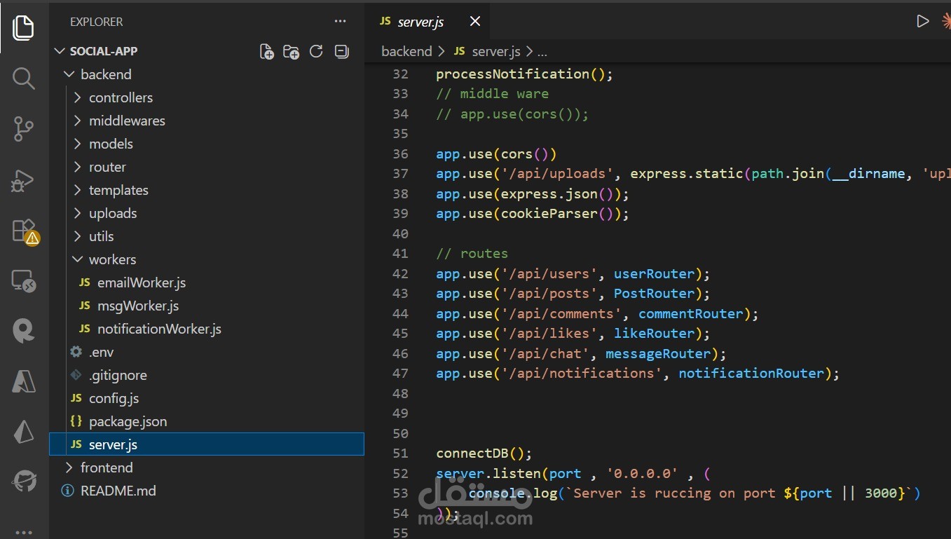 Additionally, Socket.IO powers the real-time messaging system, and Bull Queue is used to handle background jobs such as message processing and notifications.