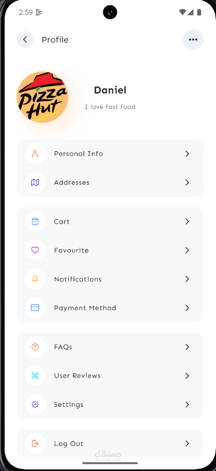يتضمن التطبيق شاشة تسجيل الدخول وإنشاء حساب لتمكين المستخدم من الوصول إلى حسابه الشخصي بأمان. كما يوفر صفحة ملف شخصي (Profile) يمكن من خلالها التنقل إلى عدة أقسام مثل العناوين المحفوظة، طرق الدفع، الطلبات السابقة، الطلبات الحالية، وسلة المشتريات لإدارة الطلبات بسهولة.
