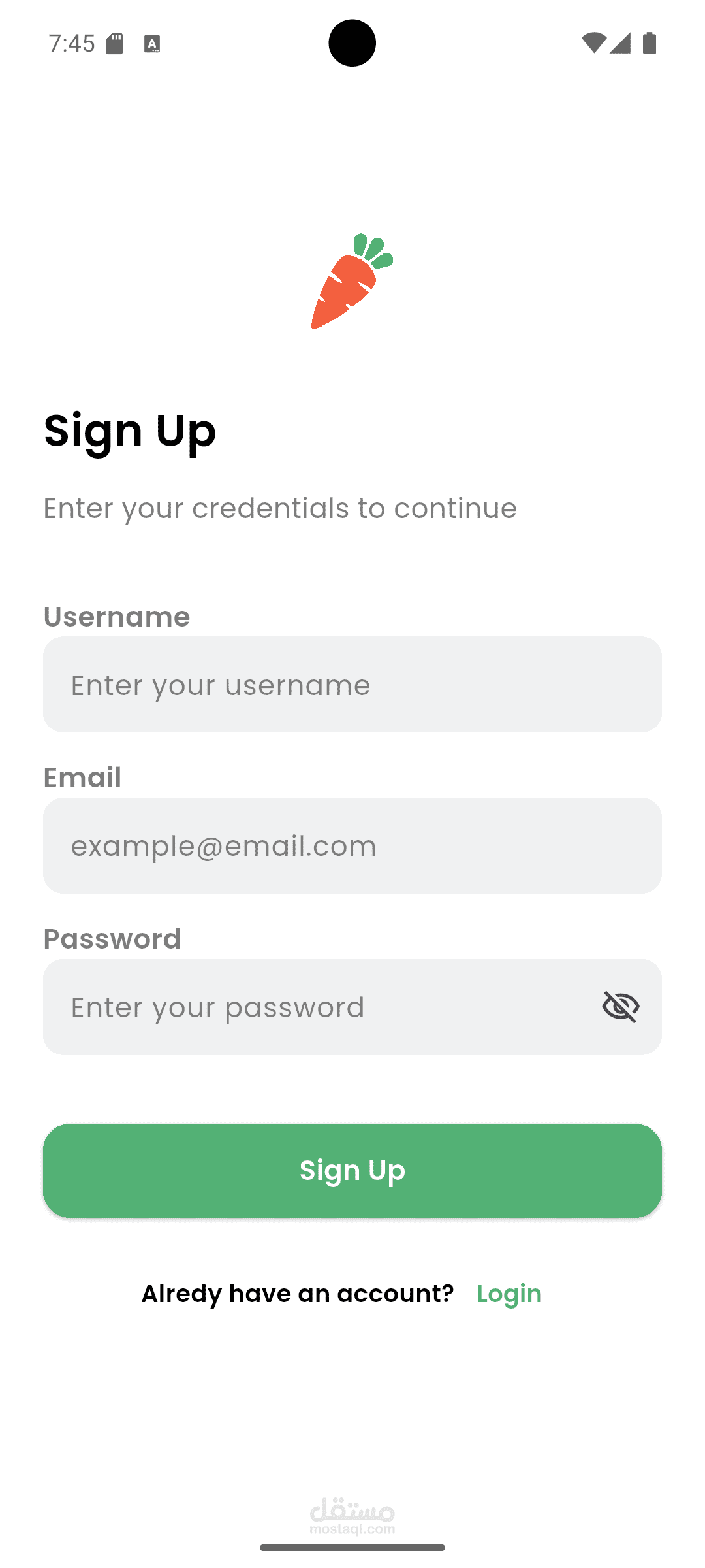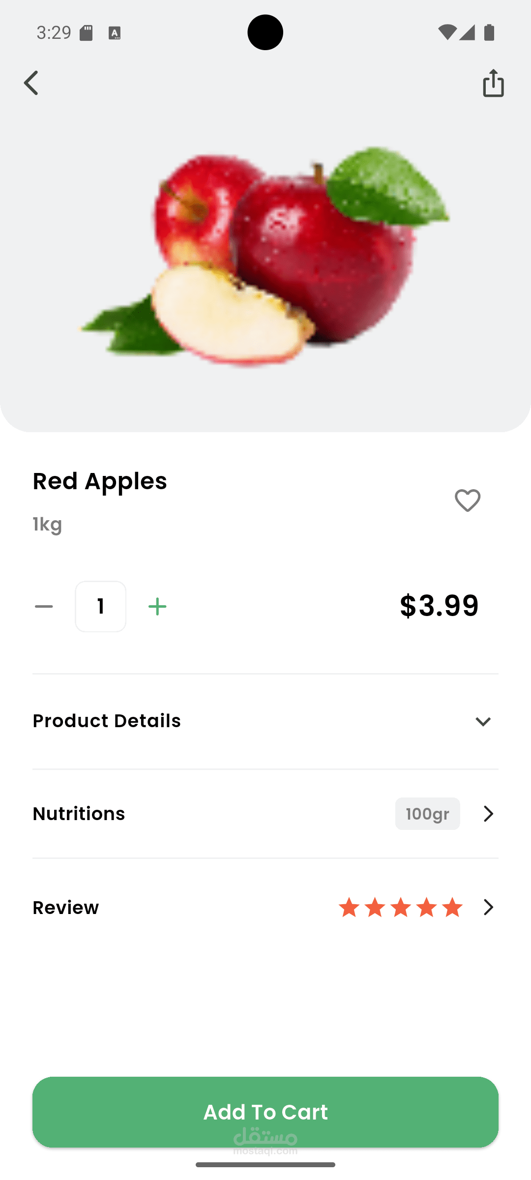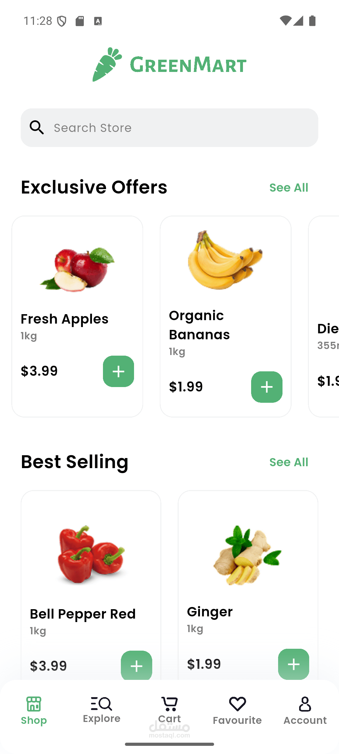 قمت بتطوير واجهات تطبيق GreenMart، وهو متجر إلكتروني عصري متخصص في بيع الخضروات والفاكهة والمنتجات العضوية.