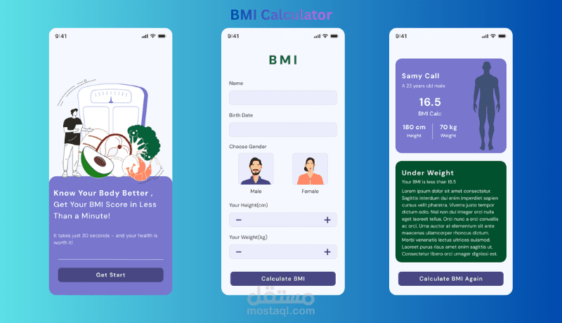 تطبيق موبايل بسيط تم تطويره باستخدام Flutter و Dart لحساب مؤشر كتلة الجسم (BMI).