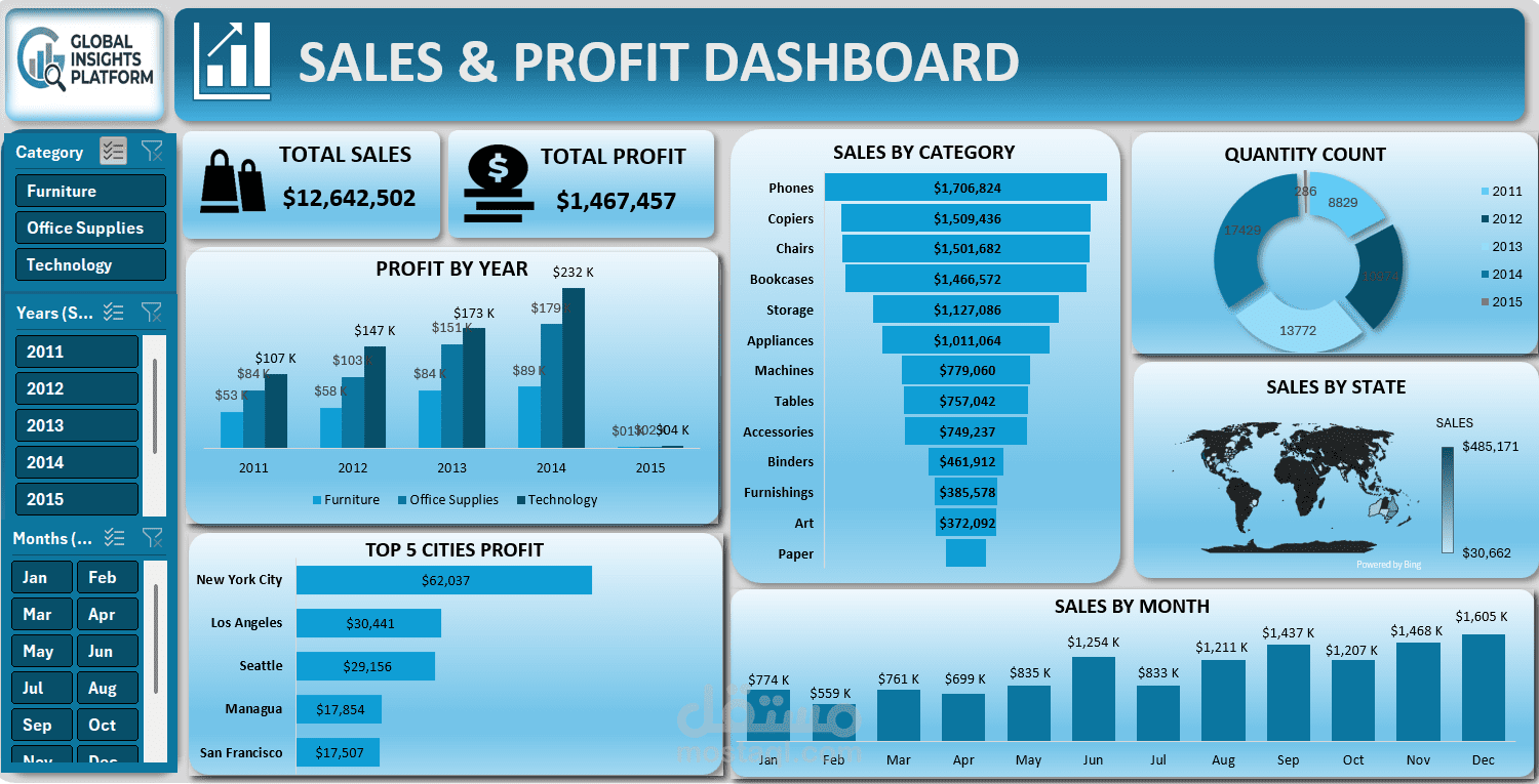 لوحة متابعة تنفيذية لقياس أداء المبيعات والأرباح عبر المنتجات والفترات الزمنية والمناطق الجغرافية. تساعد الإدارة على رصد إجمالي المبيعات والأرباح، تحديد الفئات الأعلى أداءً، معرفة التوزيع الجغرافي، وتحليل الاتجاهات الشهرية والسنوية لاتخاذ قرارات أسرع مبنية على البيانات.