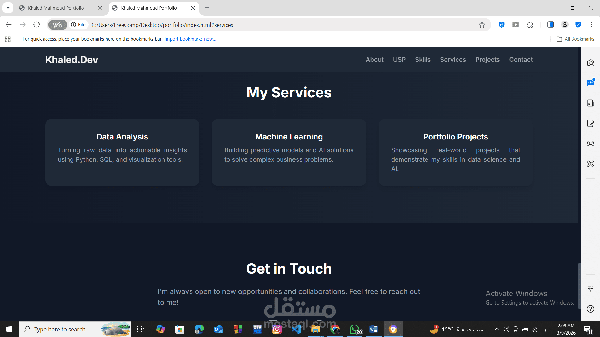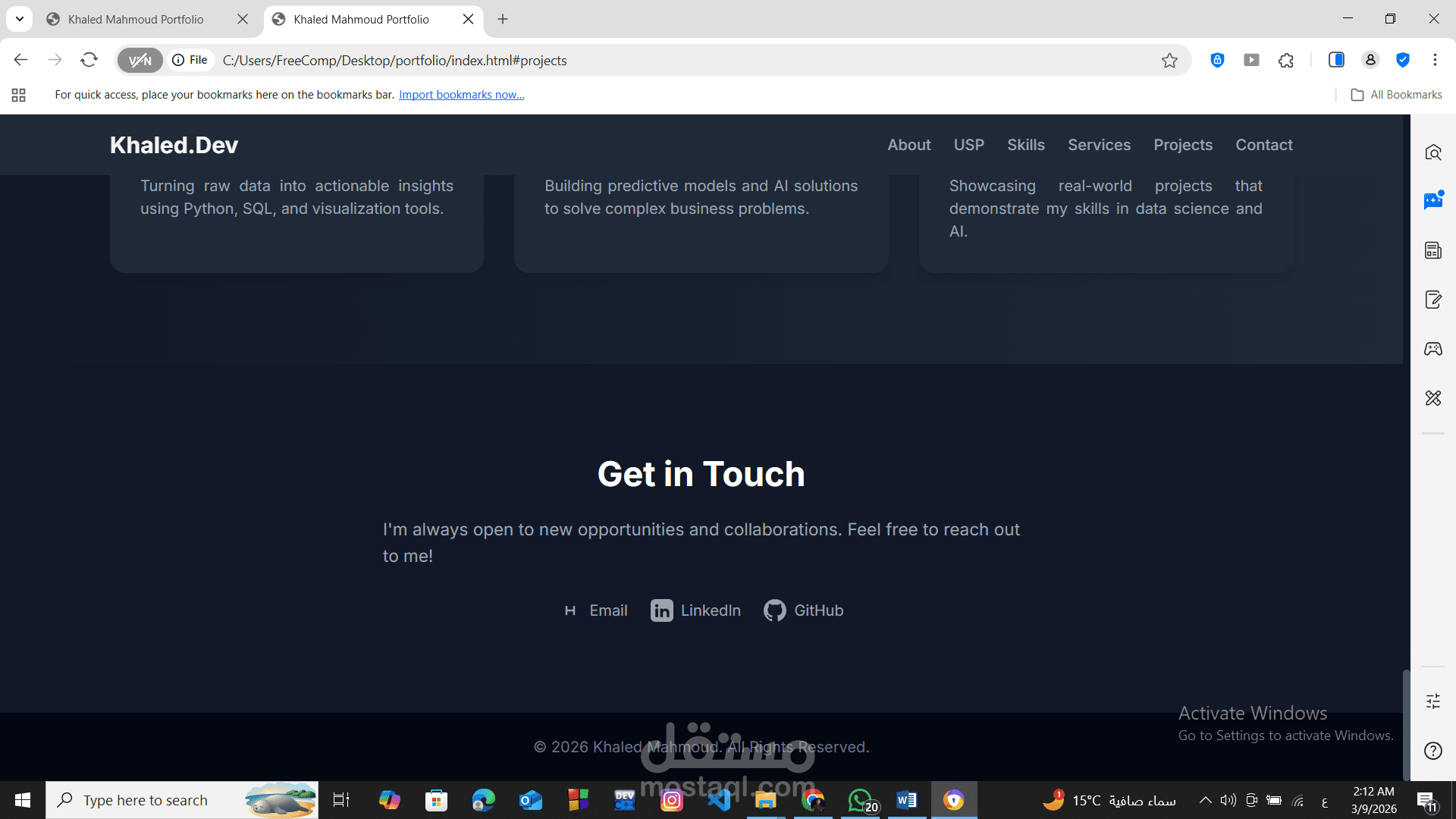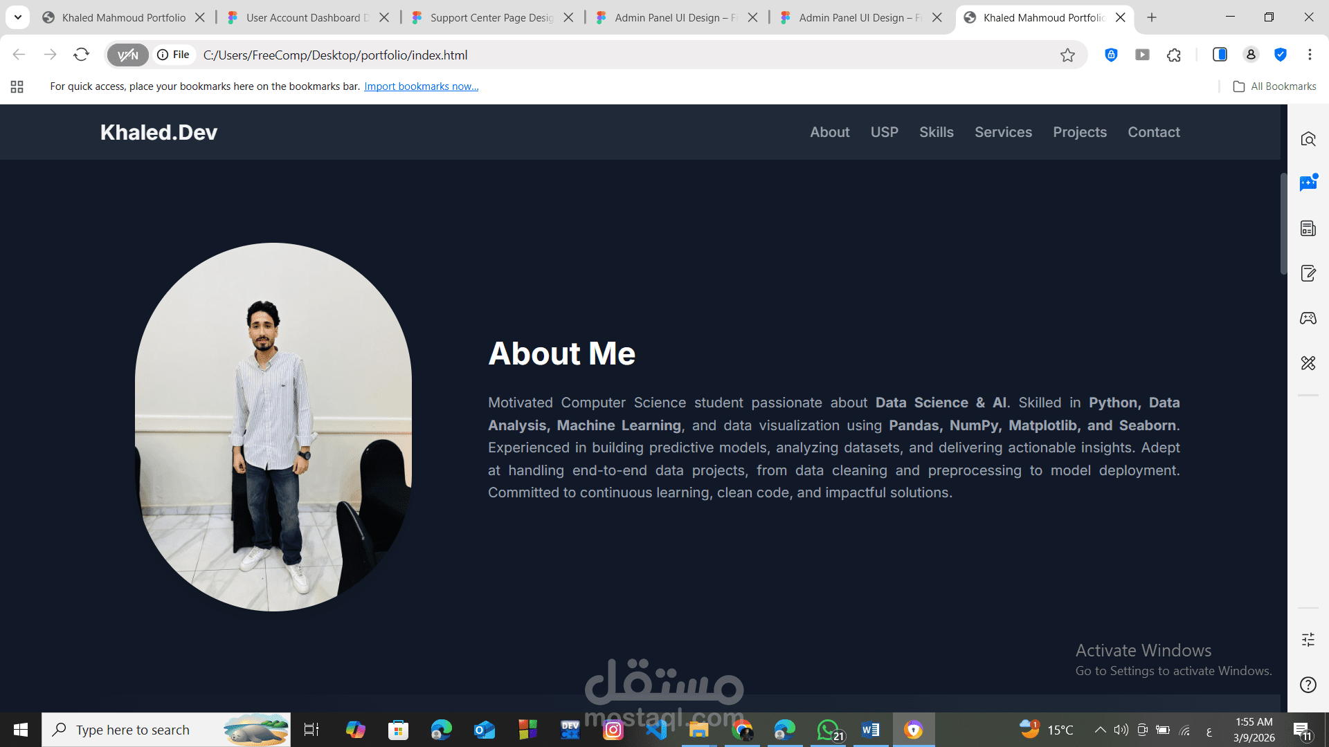 باختصار، موقع البورتفوليو هذا هو بطاقة تعريفية رقمية قوية تعكس مهاراتك في علوم البيانات والذكاء الاصطناعي، وتبرز مشاريعك بطريقة منظمة وجذابة للعملاء أو أصحاب العمل المحتملين.