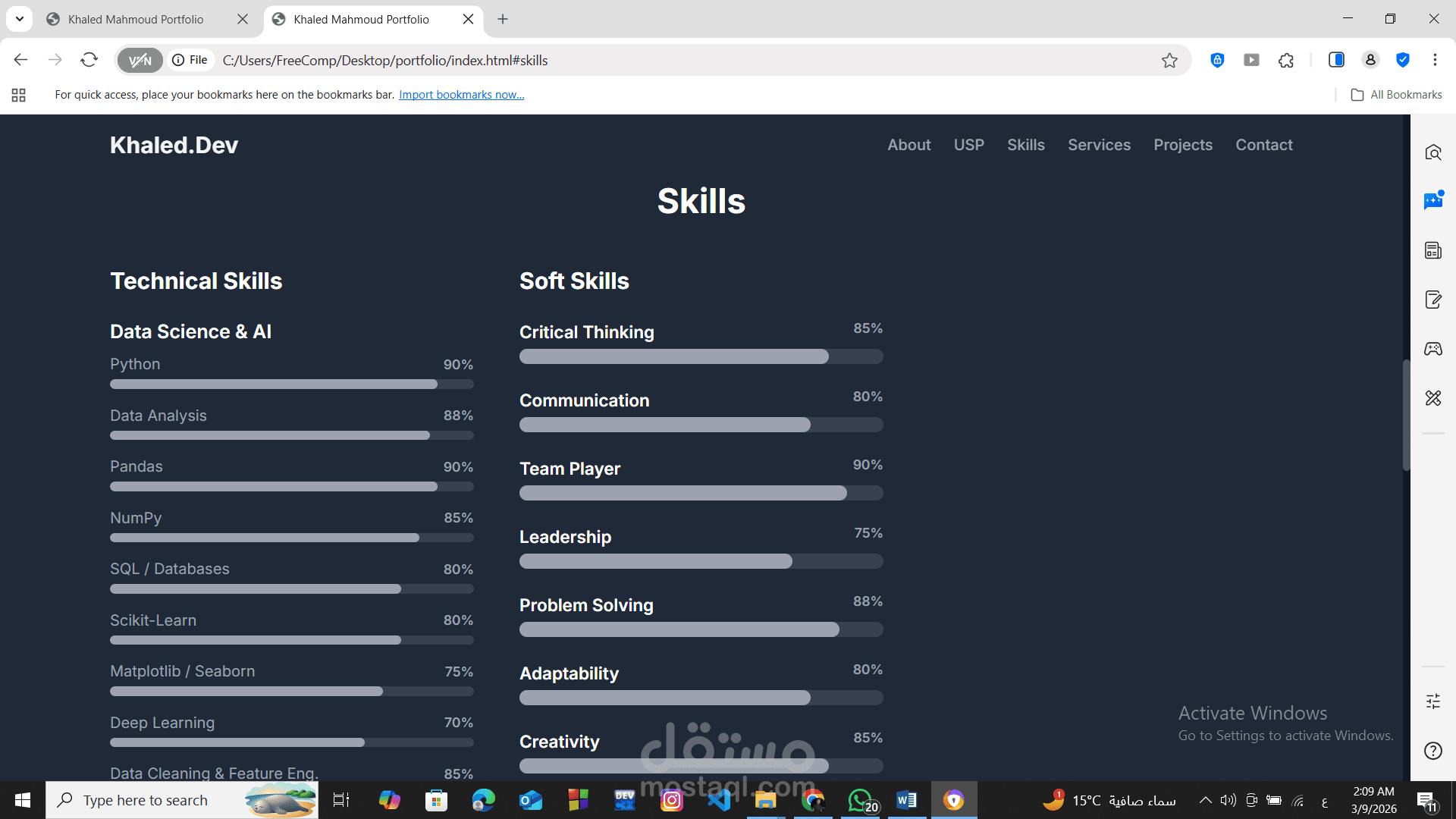 المهارات (Skills): تقسيم المهارات إلى تقنية وناعمة (Soft Skills)، مع أشرطة تقدم تفاعلية توضح مستوى إتقانك لكل مهارة.