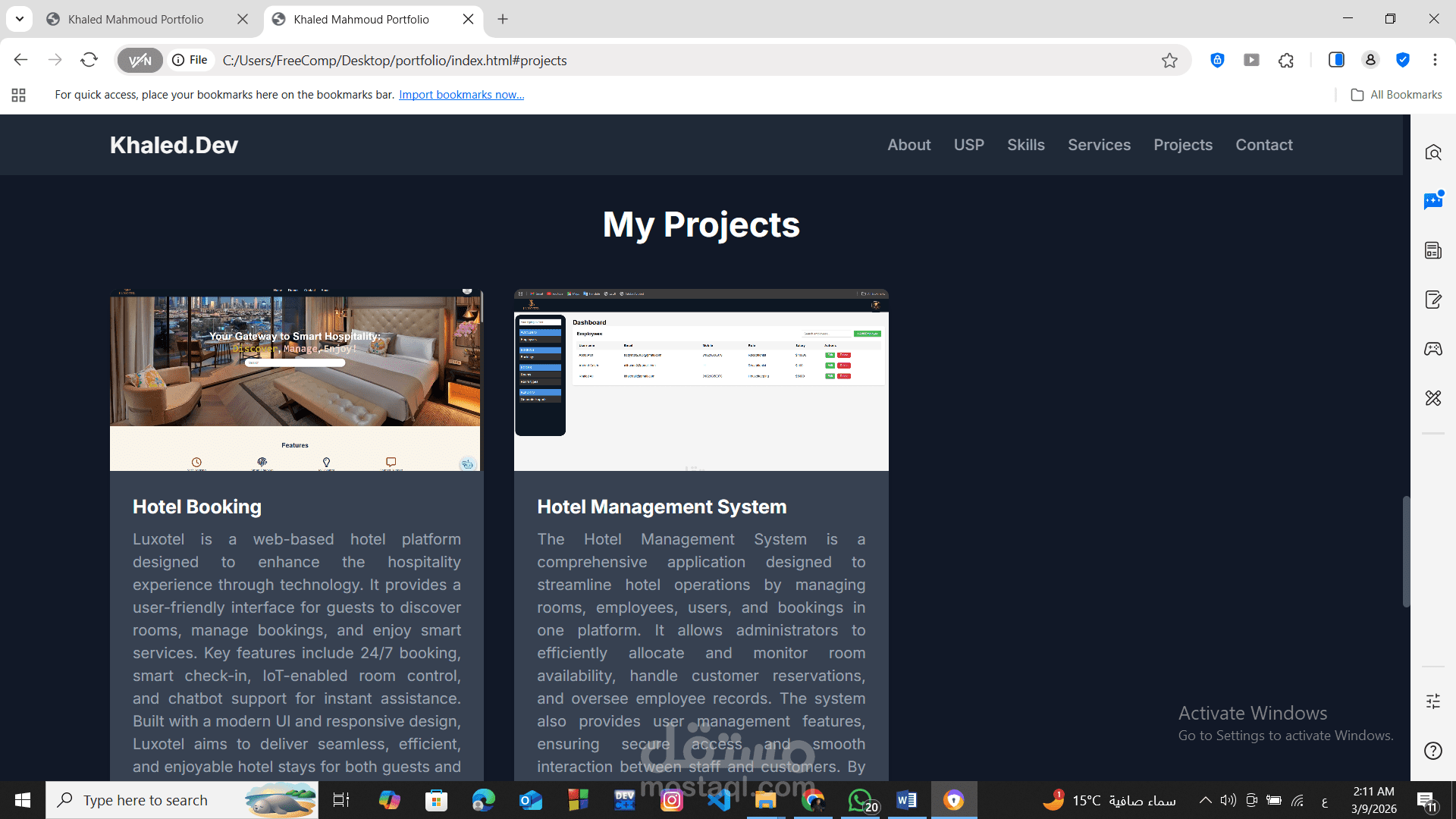 المشاريع (Projects): عرض أمثلة عملية لمشاريعك، مثل Hotel Booking و Hotel Management System، مع شرح للأهداف والميزات والتقنيات المستخدمة.