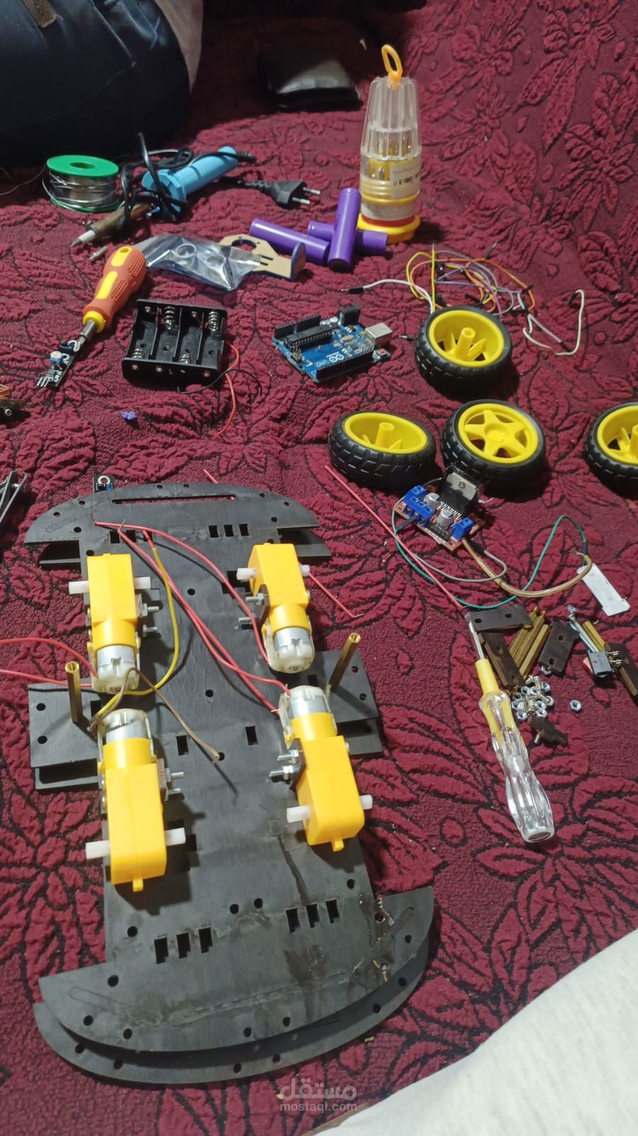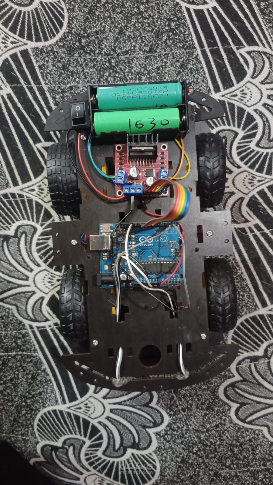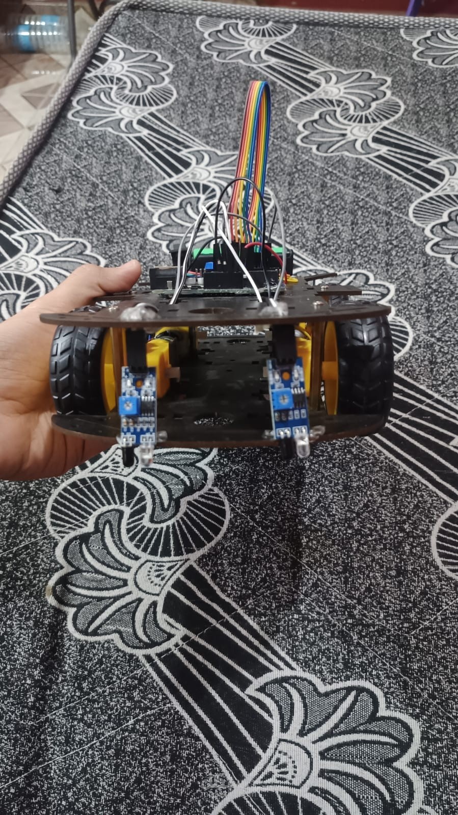 The robot typically uses infrared (IR) sensors to detect the contrast between the line and the background. These sensors send signals to a microcontroller such as Arduino, which processes the sensor data and controls the motors accordingly. If the robot detects that it is moving away from the line, the microcontroller adjusts the motor speeds to correct the direction.