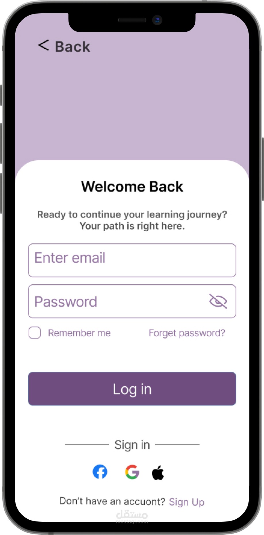 يركز التصميم على User Friendly Experience من خلال ترتيب العناصر بشكل واضح مثل حقول الإدخال (Email & Password)، الأزرار، وخيارات تسجيل الدخول.