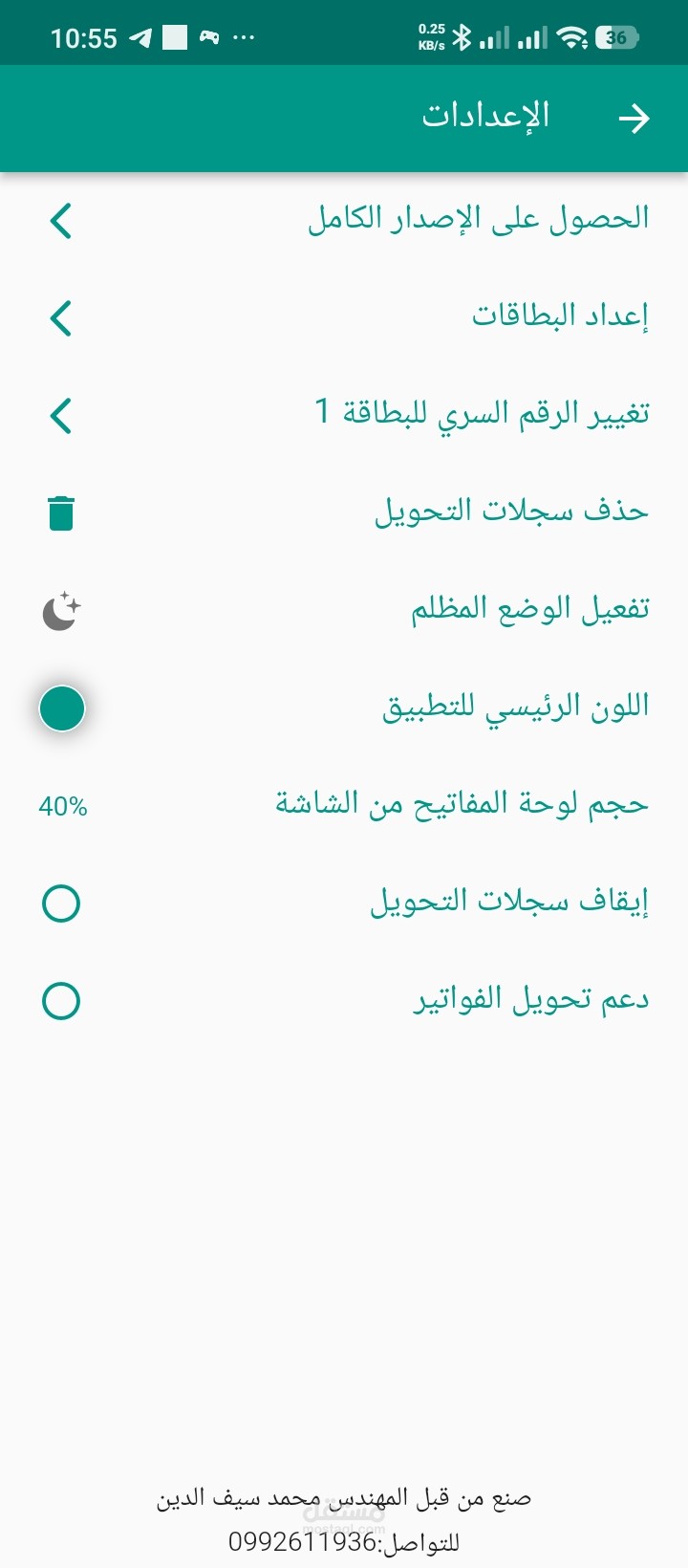 تطبيق لشحن رصيد الموبايل، يتميز بتسهيل العملية قدر الإمكان بوجود سجل تحويل و قائمة بفئات التحويل وغيرها من الأمور مع القدرة على التخصيص بشكل كبير من الوان واحجام القطع، وايضا سجل الديون وسجل التحويلات.