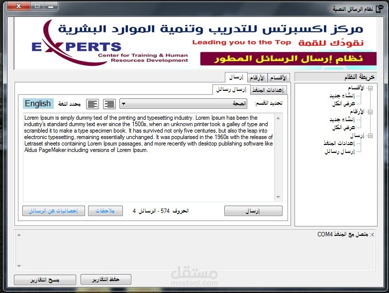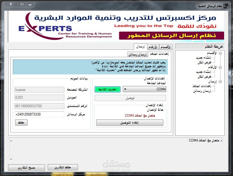 البرنامج عبارة عن نظام يعمل على الحاسوب حيث تقوم بتوصيل المودم فتظهر المنافذ المتاحة في شكل COM1, COM2, COM3 بعدها المنفذ بعد الاتصال الناجح بين النظام والمودم يمكنك كتابة رسائل بالغتين العربية والانجليزية وتتم عملية الارسال من الشريحة الموجودة داخل المودم والتكلفة تخصم من الرصيد الموجود في الشريحة