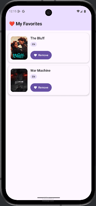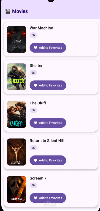تطبيق أندرويد لعرض واستكشاف الأفلام باستخدام واجهة حديثة مبنية بـ Jetpack Compose. يتيح التطبيق للمستخدم تصفح الأفلام وعرض تفاصيلها وإضافة الأفلام المفضلة للوصول إليها بسهولة لاحقًا.