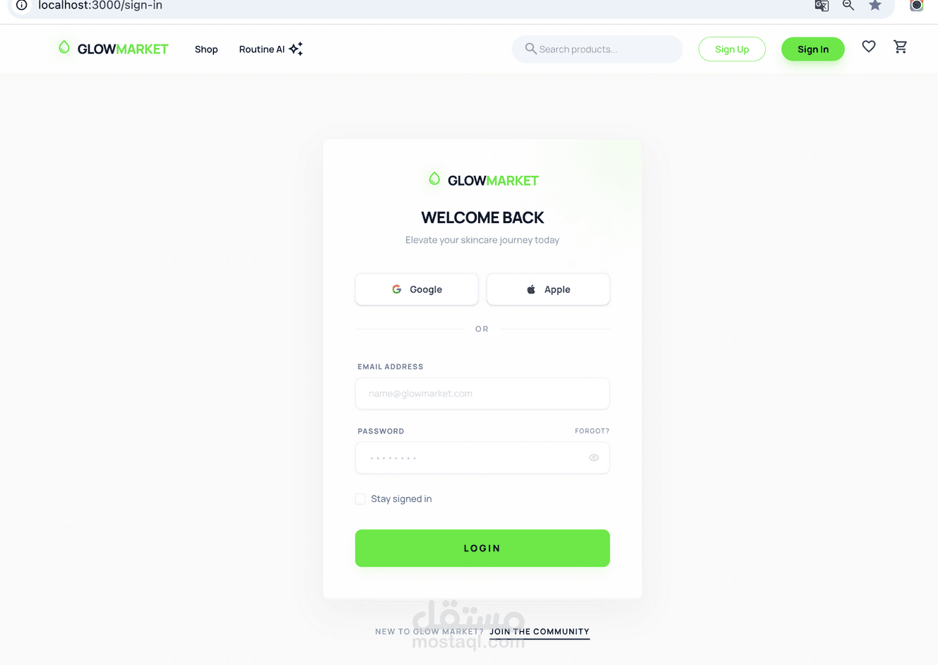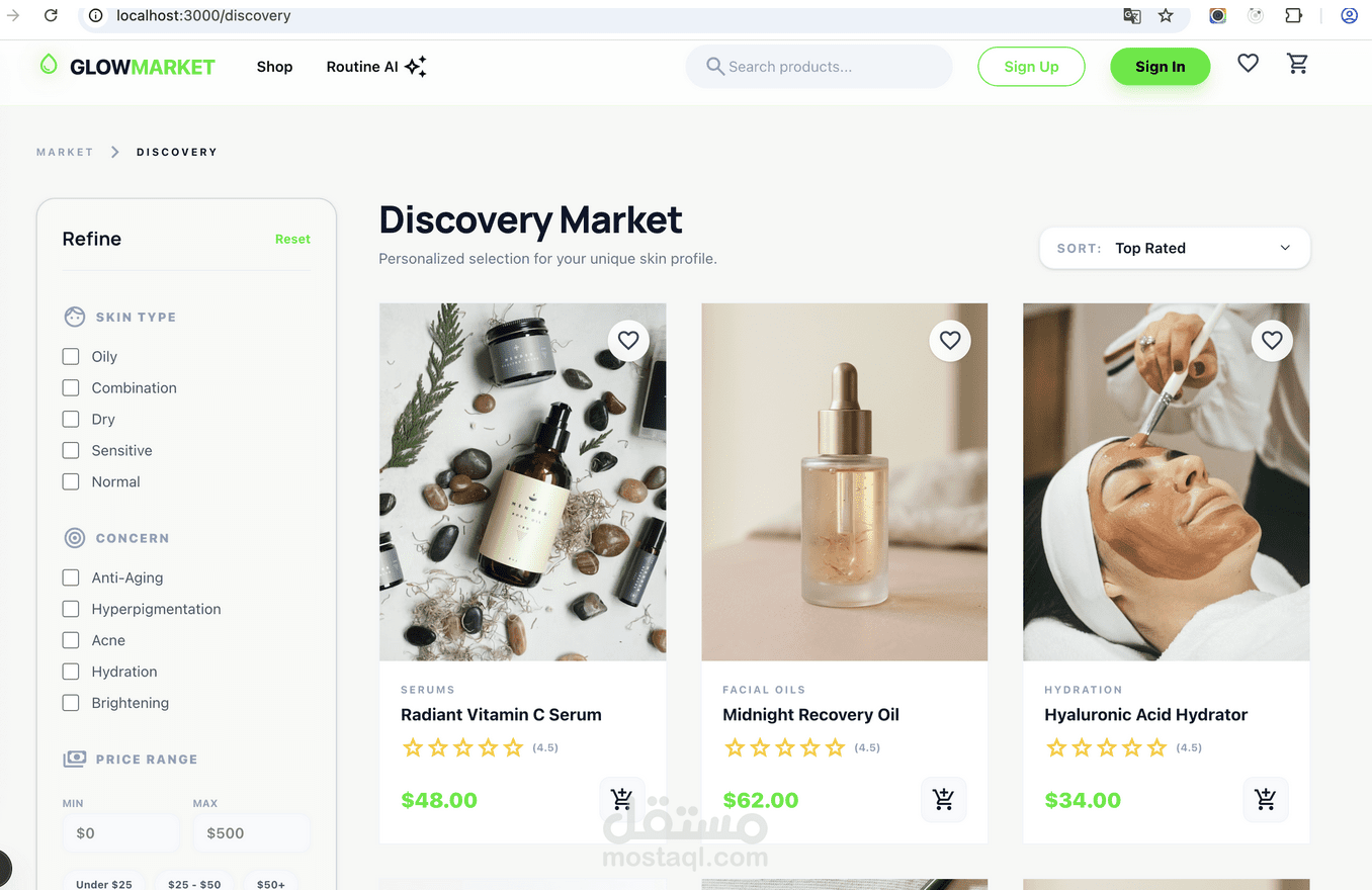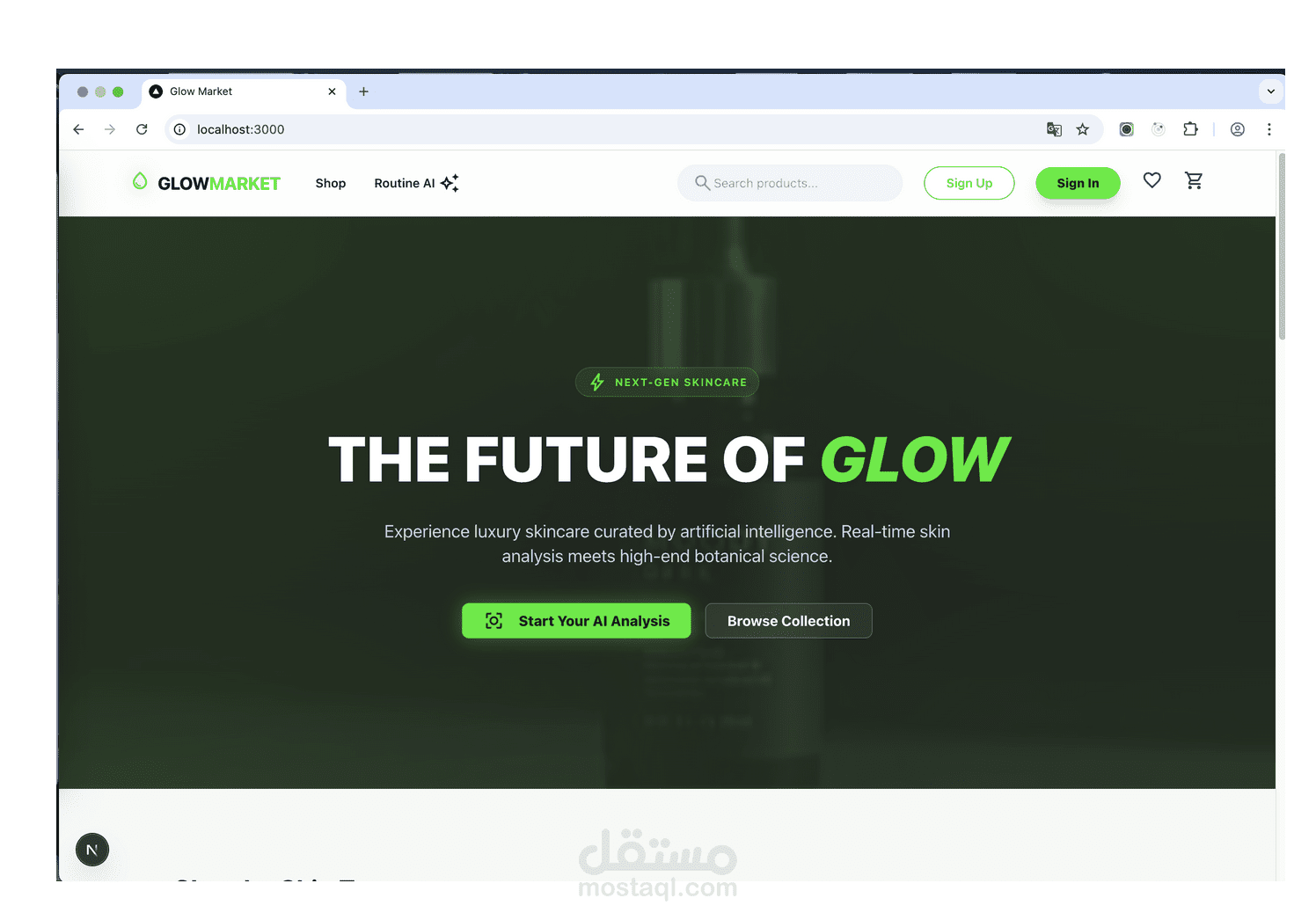 Glow Up Market هو سوق إلكتروني متخصص في منتجات التجميل، تم تطويره باستخدام تصميم حديث يعتمد على Glassmorphism وتقنيات حديثة مثل Next.js 14 و TypeScript لتقديم تجربة مستخدم سريعة وعصرية.