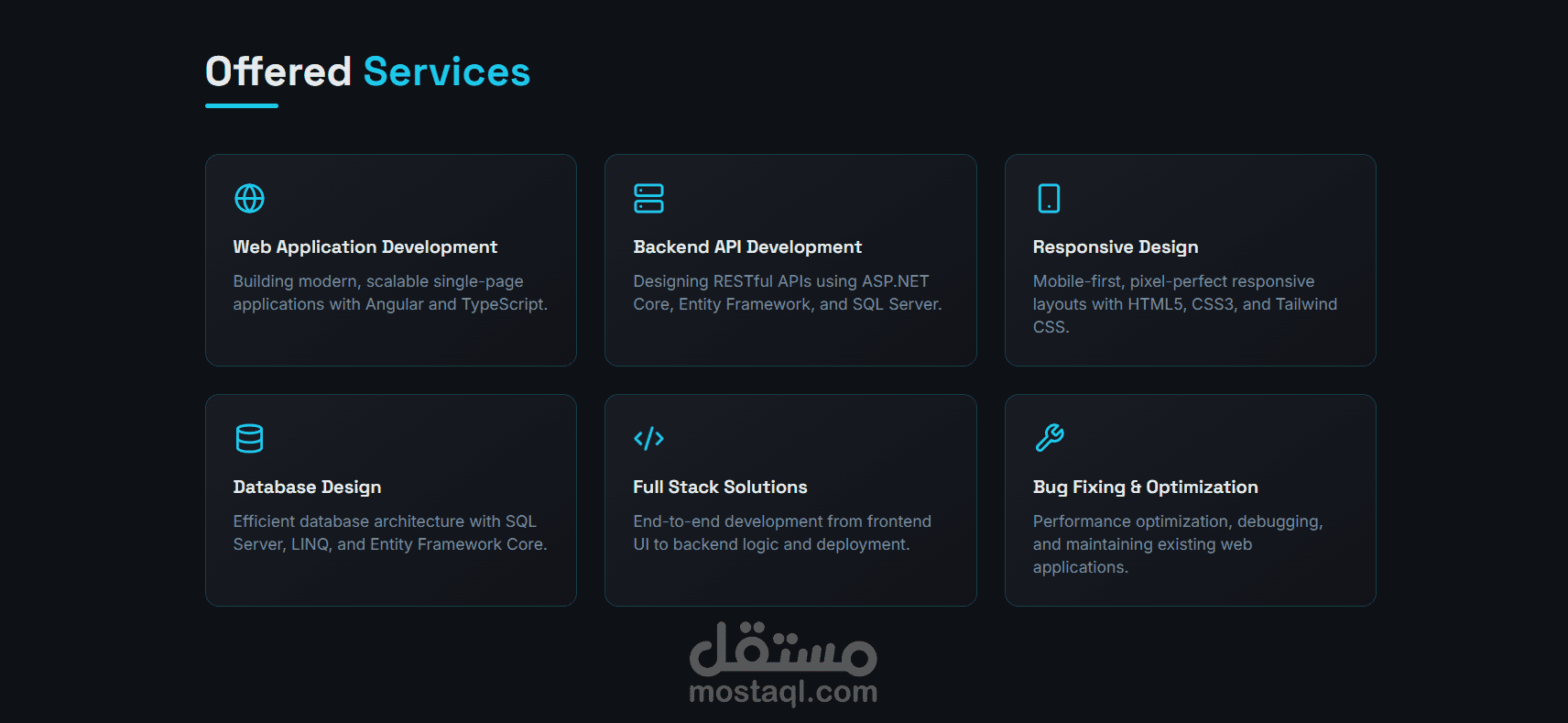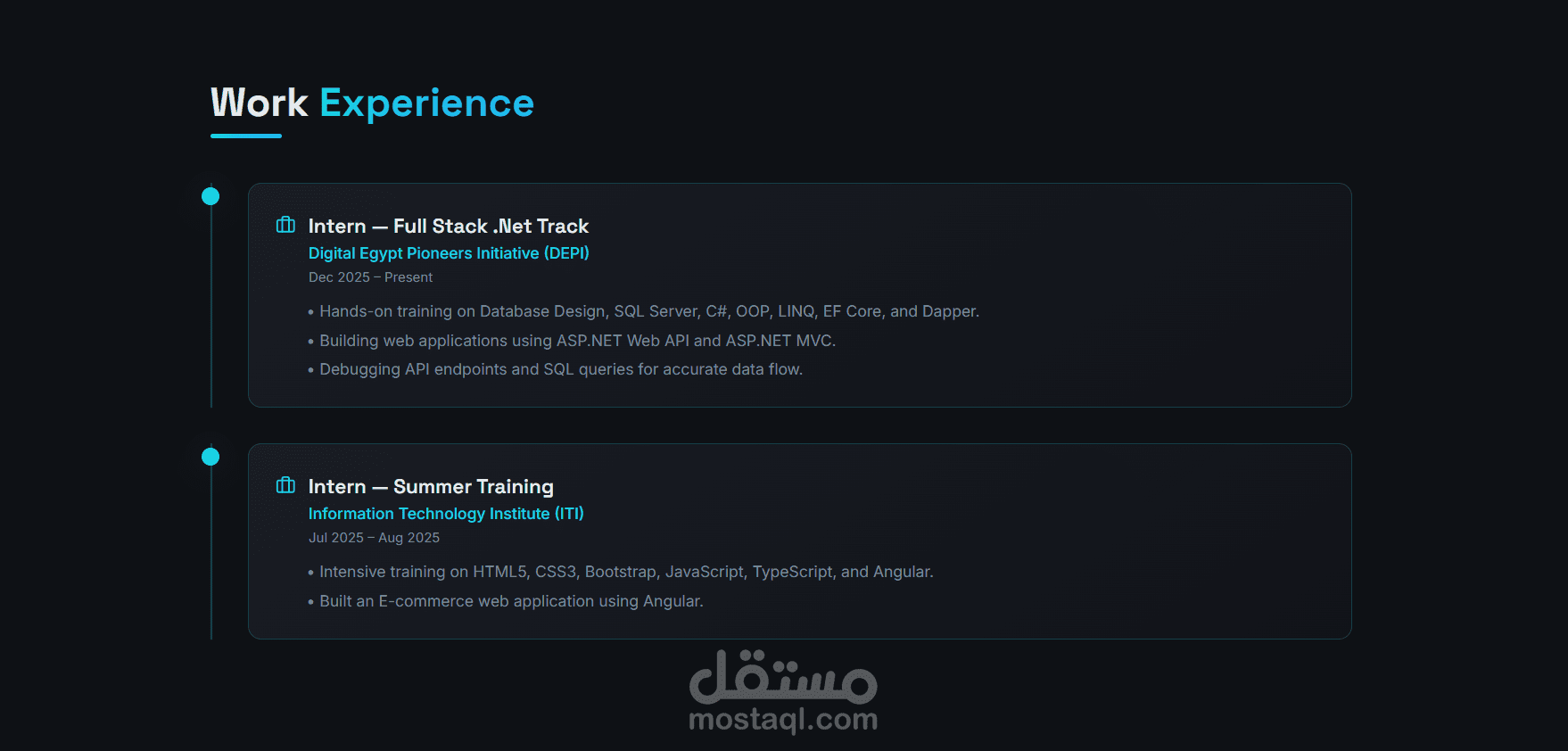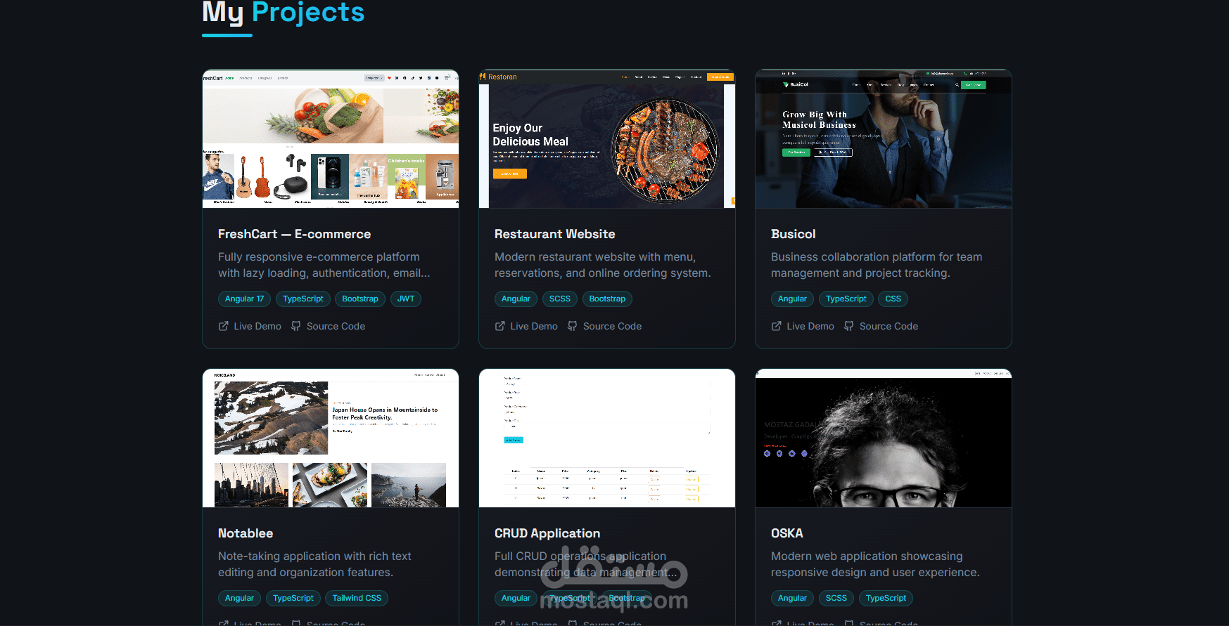 قسم المشاريع يعرض البروجكتات الخاصة بي مع صور ووصف وروابط مباشرة للـ GitHub والديمو.