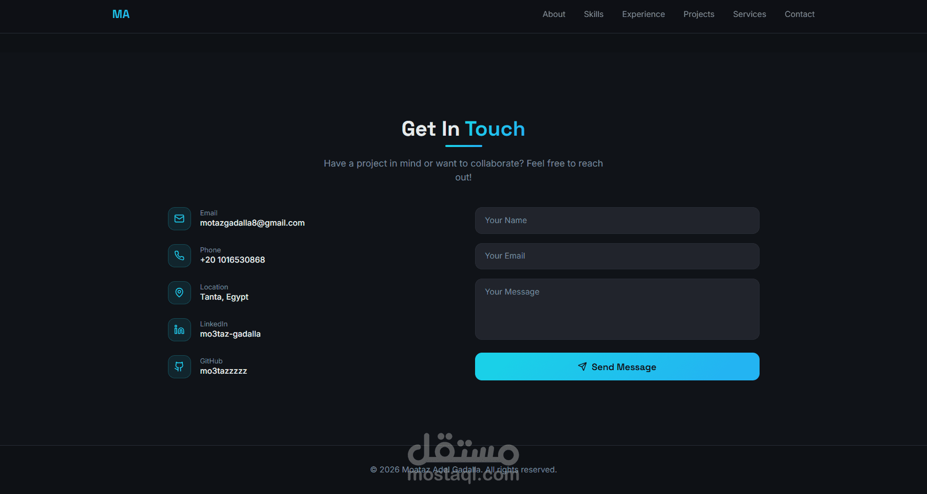 موقع بورتفوليو شخصي تم تطويره باستخدام Reactبهدف عرض مهاراتي، وأعمالي، وخبراتي في تطوير واجهات المستخدم بشكل احترافي.