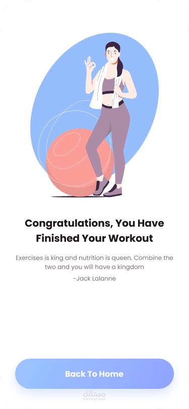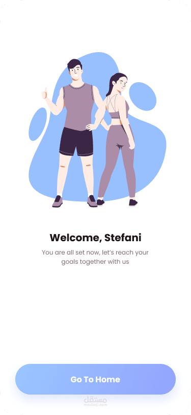 يضم التطبيق 12 شاشة تشمل: شاشة ترحيب، ثلاث شاشات تعريفية (Onboarding)، تسجيل دخول وإنشاء حساب، صفحة رئيسية تعرض مؤشرات صحية شاملة كمعدل ضربات القلب ومؤشر كتلة الجسم واستهلاك الماء والنوم والسعرات، ومتتبع للنشاط اليومي، وشاشة إشعارات، وملف شخصي، وشاشة تهنئة عند إتمام التمرين.