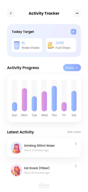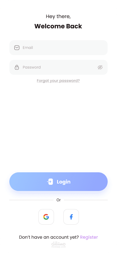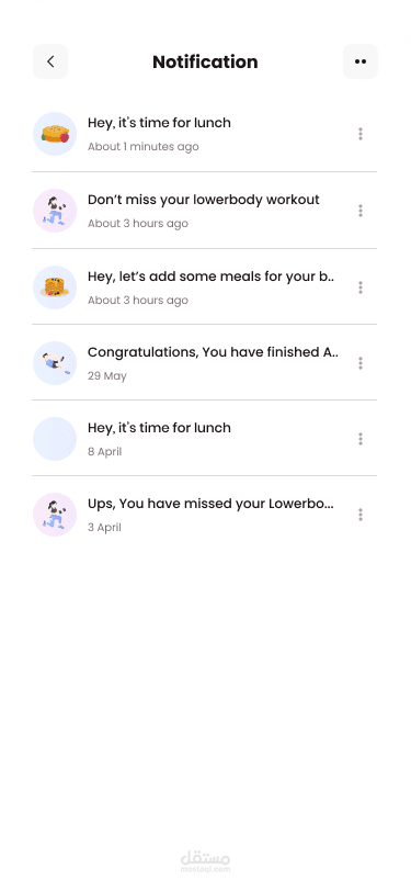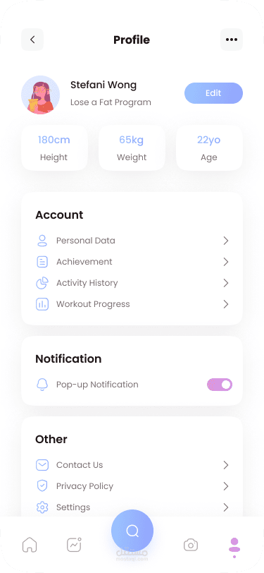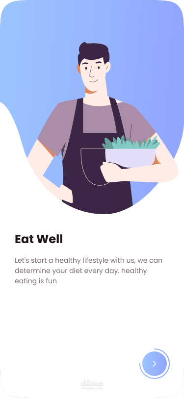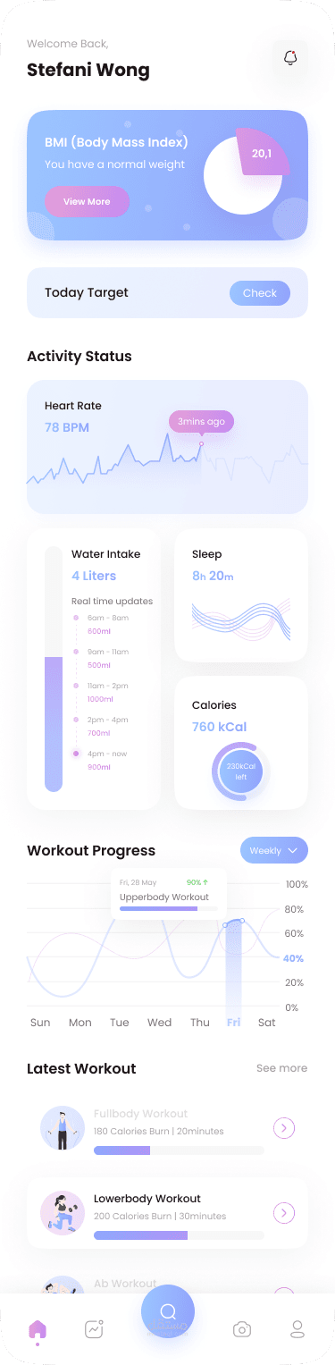 يدعم التطبيق التسجيل عبر البريد الإلكتروني أو الحسابات الاجتماعية (Google وFacebook)، ويُرسل إشعارات ذكية لتذكير المستخدم بالوجبات والتمارين وتحفيزه على الاستمرار. يتميز بتصميم بصري هادئ يعتمد على درجات الأزرق والبنفسجي مع رسومات توضيحية تحفيزية.