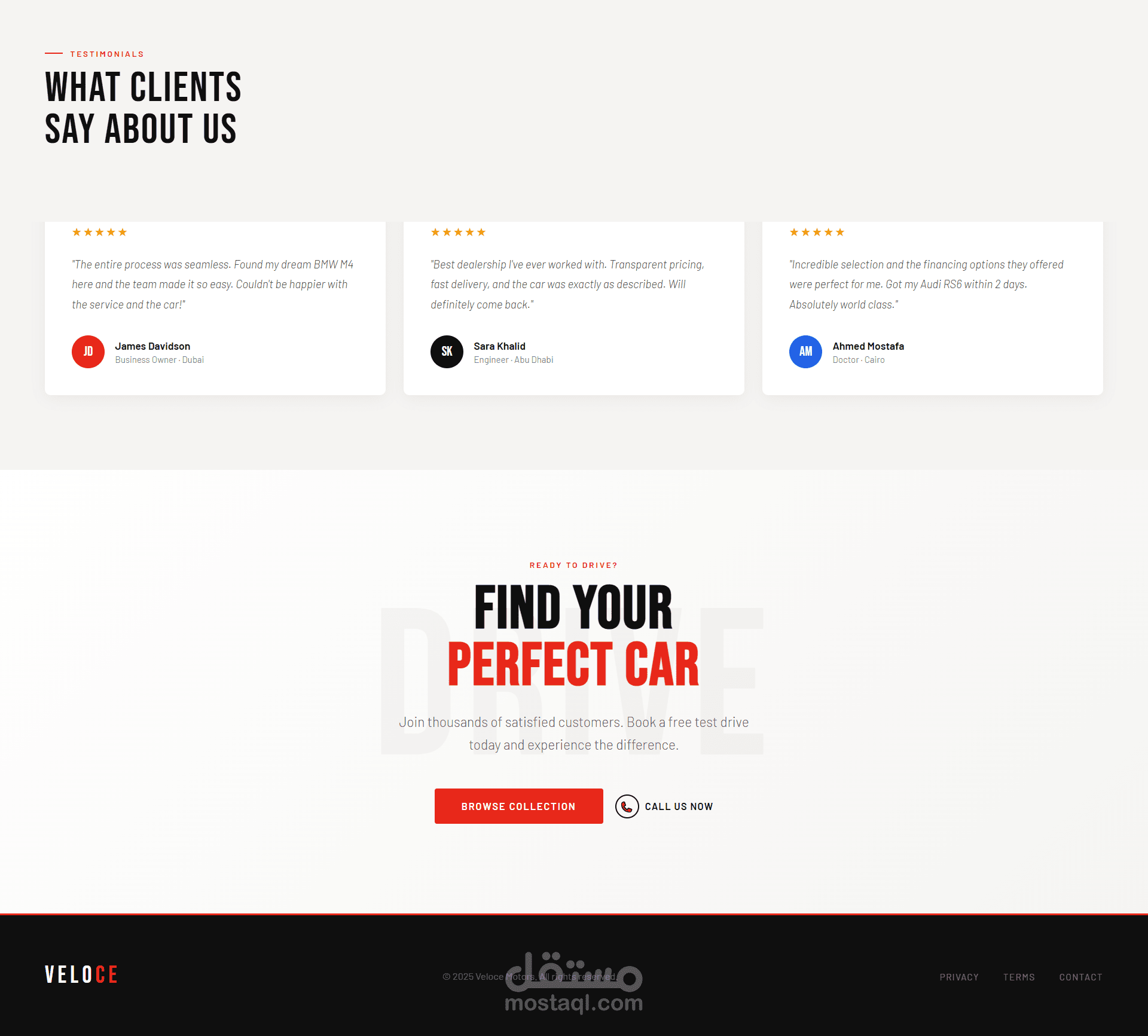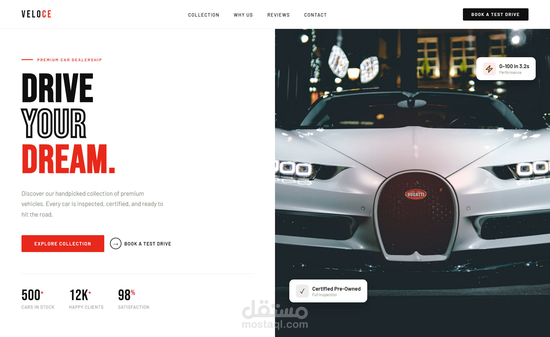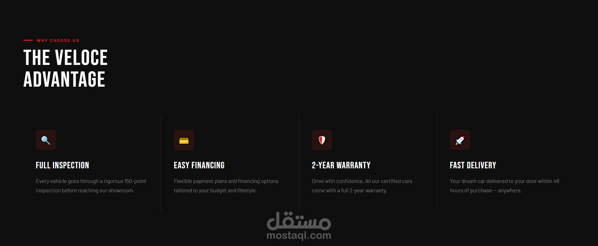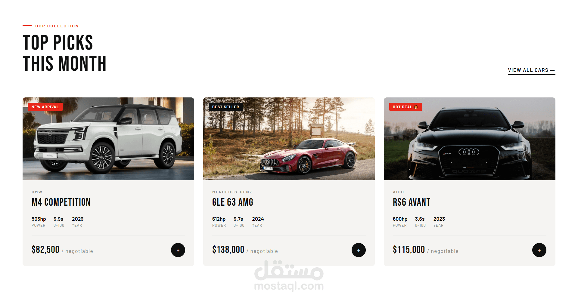 تتميز الصفحة بـ تصميم متجاوب (Responsive) يعمل بكفاءة على جميع الأجهزة مثل الموبايل والتابلت والكمبيوتر، مع تنظيم جيد للأقسام لعرض السيارات والمميزات بطريقة احترافية.
