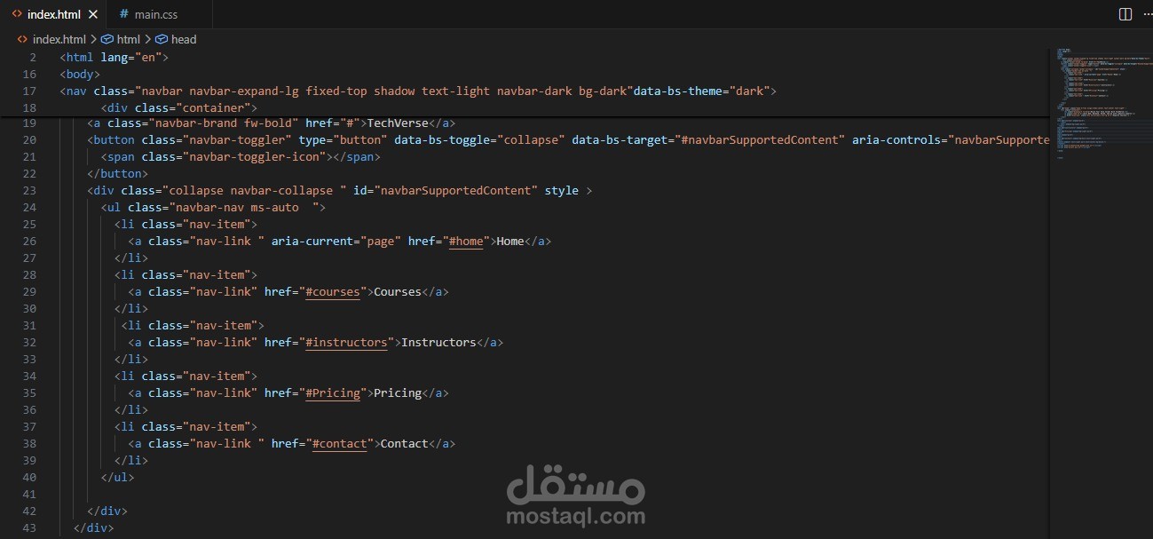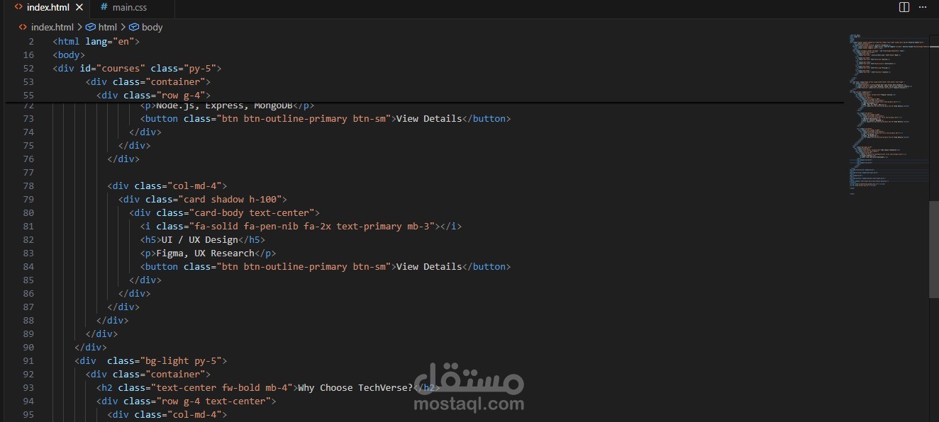 تصميم وتطوير واجهة موقع تعليمي باسم TechVerse يهدف إلى مساعدة المستخدمين على بناء مسار مهني في مجال التكنولوجيا. يتضمن الموقع صفحة رئيسية تحتوي على شريط تنقل يضم الأقسام الأساسية مثل الصفحة الرئيسية، الدورات، المدربون، الأسعار، والتواصل. كما يحتوي على قسم رئيسي (Hero Section) يعرض عنوانًا جذابًا يشجع المستخدمين على تعلم مجالات تقنية مختلفة مثل تطوير الويب، البرمجة الخلفية، تصميم واجهات وتجربة المستخدم، والذكاء الاصطناعي، مع زر مخصص لاستكشاف الدورات المتاحة. يتميز التصميم بالبساطة والوضوح مع استخدام ألوان حديثة وتنسيق يركز على تجربة المستخدم.