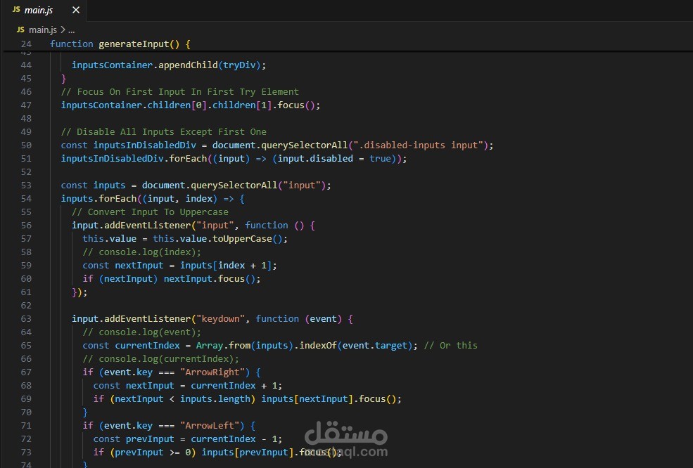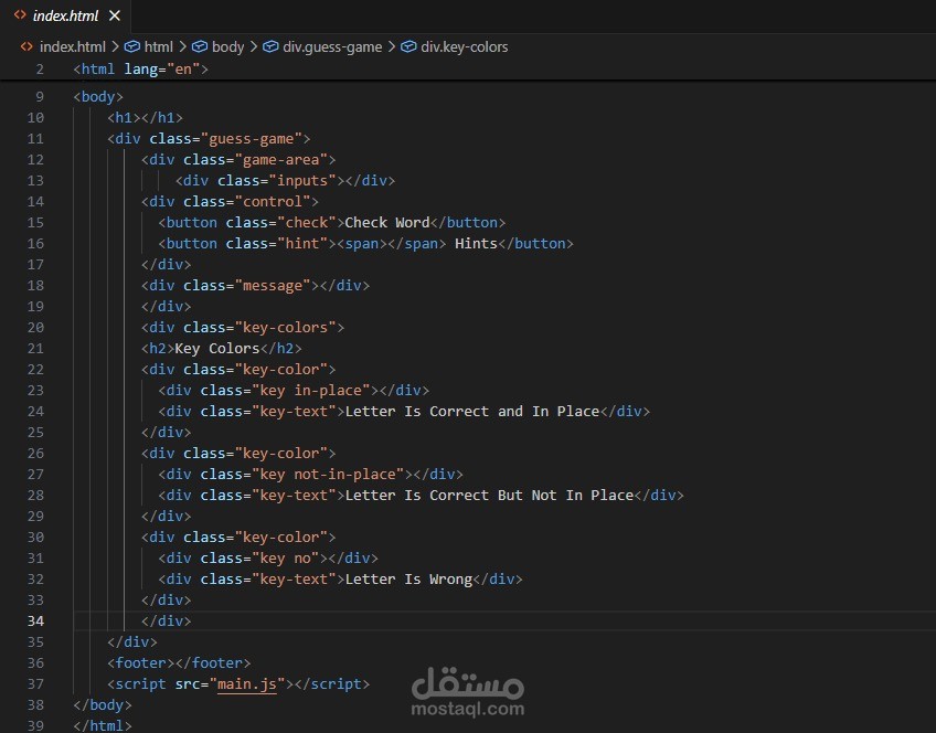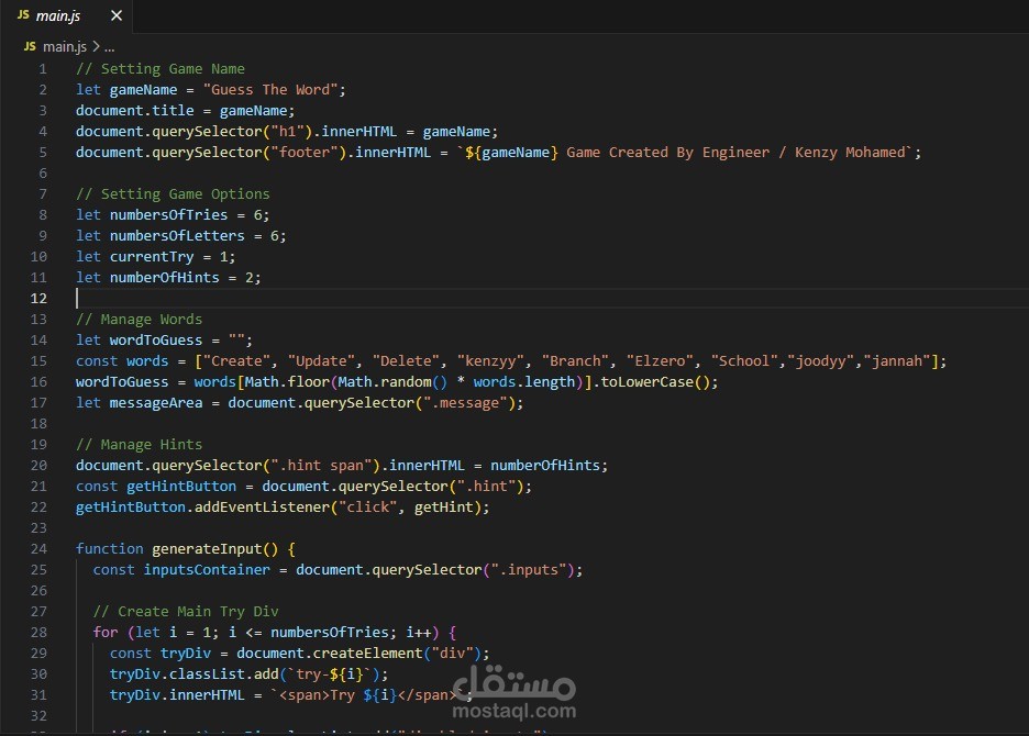 تطوير لعبة تفاعلية على الويب باسم Guess The Word باستخدام لغة JavaScript، حيث تهدف اللعبة إلى تخمين كلمة مكونة من عدة حروف خلال عدد محدد من المحاولات. تحتوي الواجهة على ست محاولات (Try 1 إلى Try 6)، ويقوم المستخدم بإدخال الحروف في الخانات لمحاولة اكتشاف الكلمة الصحيحة.