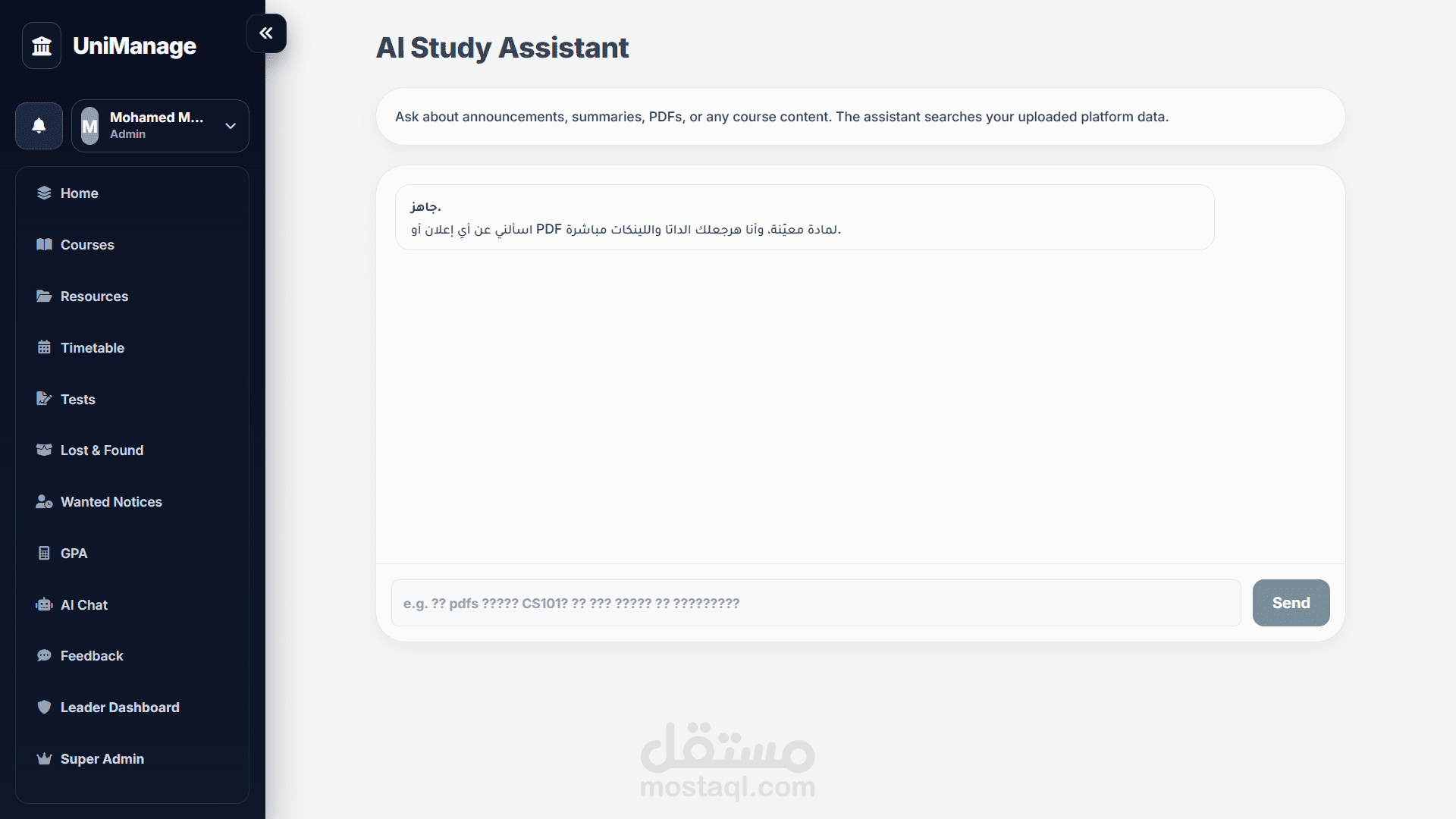 واخيرا كان لازم اختم AI Agent عشان يجاوبك على اي اسئلة او استفسارات سواء عن مادة ، مواعيد دكاترة ، اماكن او حتى ملفات مش عارف توصلها.