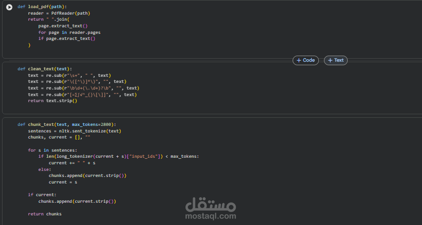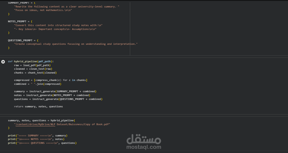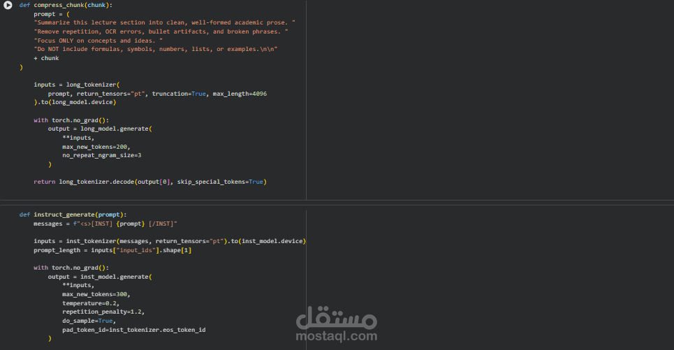 كما قمت بتجربة عدة أساليب وتقنيات مختلفة لتحسين جودة الملخصات، وضبط معايير النموذج (Hyperparameter Tuning) للوصول إلى أفضل أداء ممكن. شمل العمل أيضًا تقييم أداء النموذج باستخدام مقاييس مناسبة لتقييم جودة التلخيص وضمان أن النتائج النهائية دقيقة ومترابطة وتحافظ على الفكرة الأساسية للنص.
