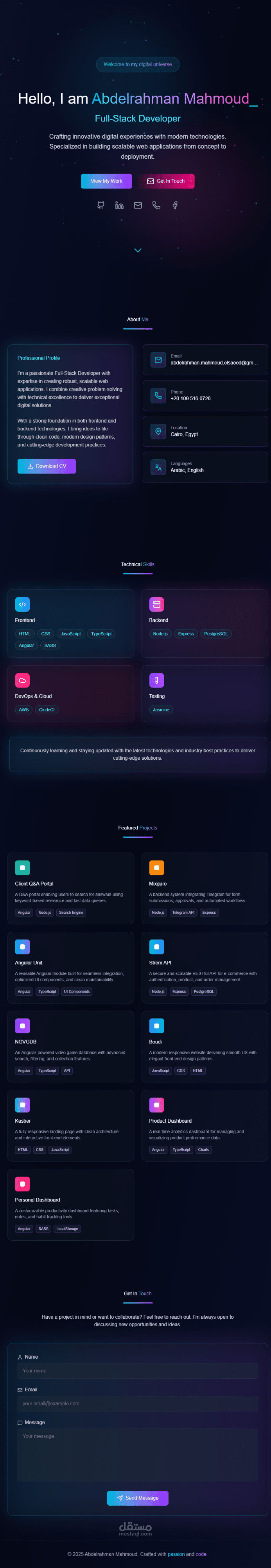 1) المشروع عبارة عن موقع بورتفوليو شخصي يهدف إلى عرض خبراتي المهنية، مهاراتي التقنية، وأبرز المشاريع التي عملت عليها.