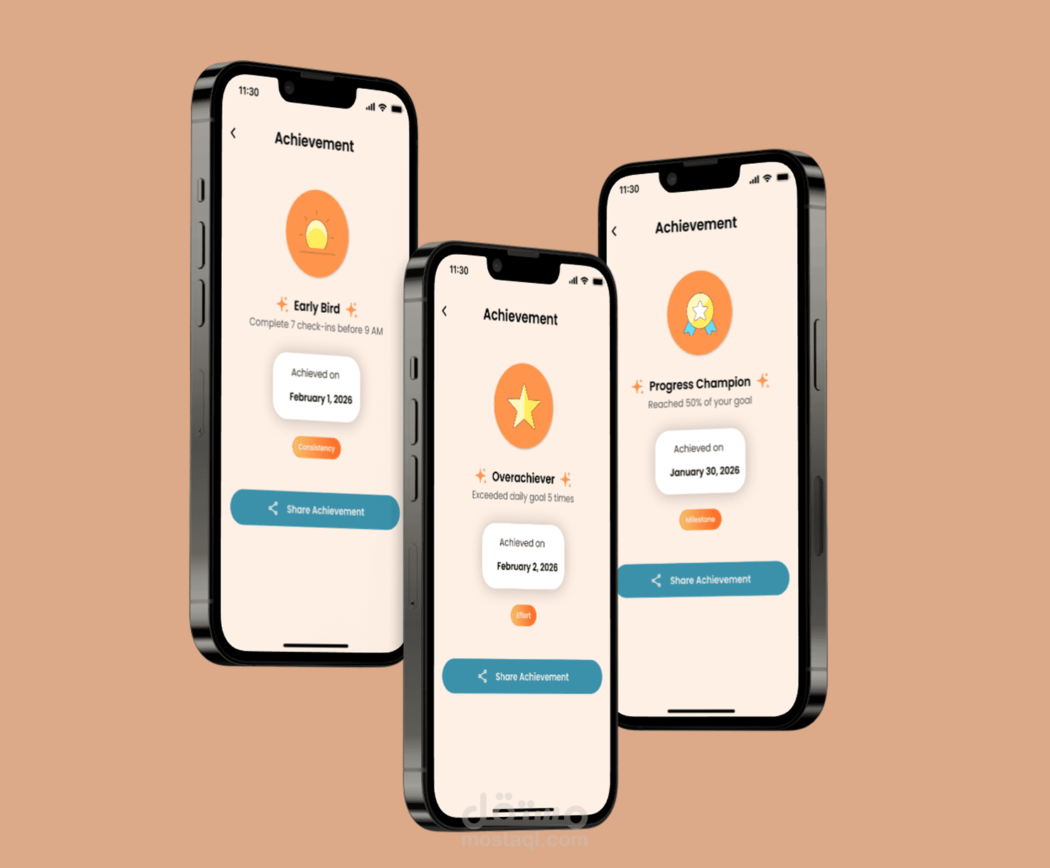 عملت على تبسيط رحلة المستخدم أثناء تتبع تقدمه، تحقيق المراحل المختلفة (Milestones)، والحصول على المكافآت (Achievements)، بهدف جعل التجربة أكثر تحفيزًا ووضوحًا للمستخدم.