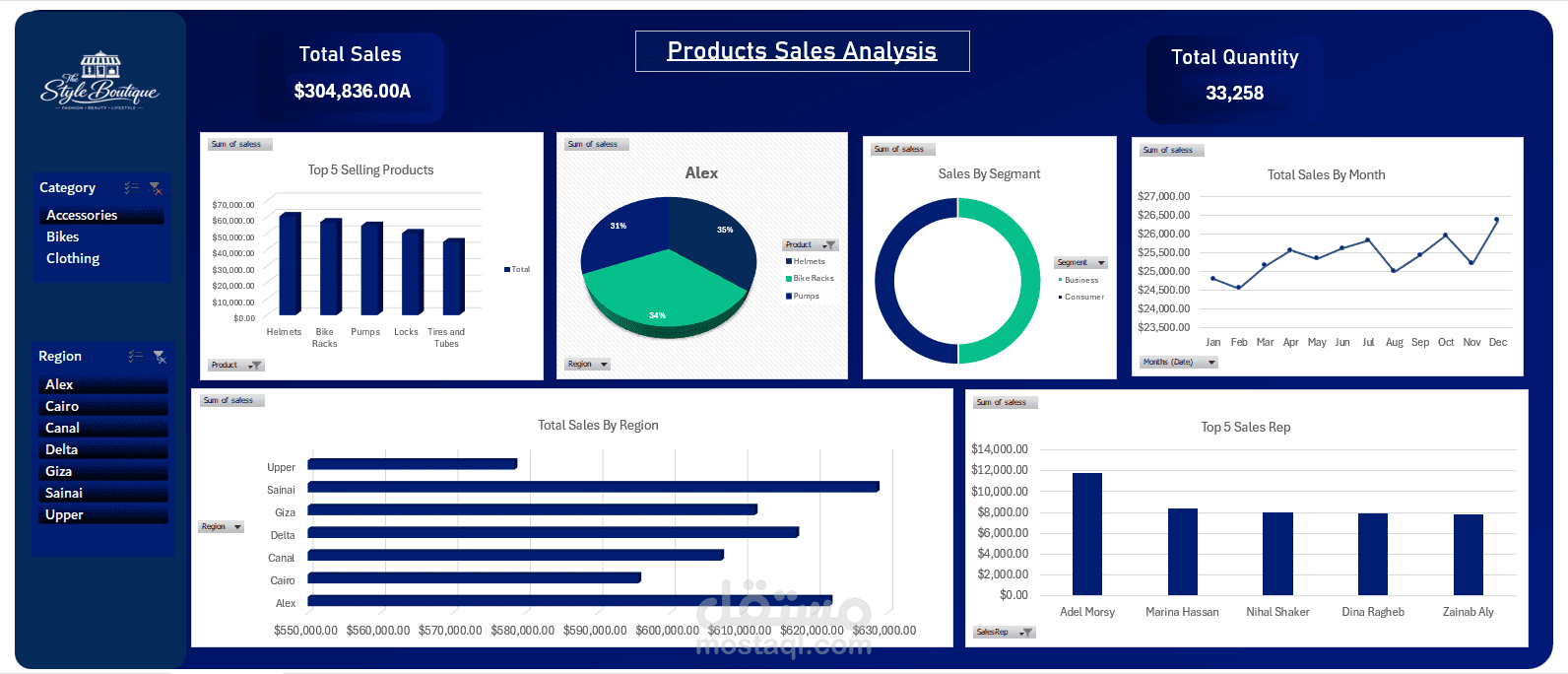 كما تحتوي اللوحة على فلاتر تفاعلية مثل الفئة والمنطقة لتمكين المستخدم من استكشاف البيانات بسهولة واستخراج رؤى مفيدة من البيانات.