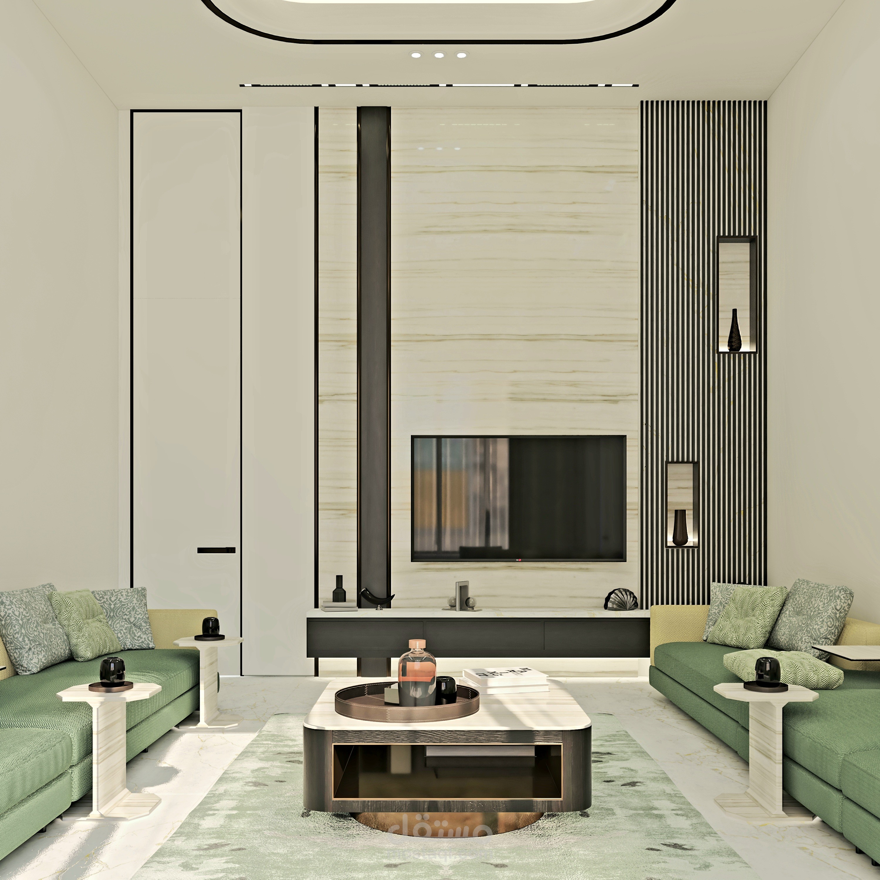 تصميم ديوانية يجمع بين البساطة العصرية والراحة المنزلية من خلال لوحة ألوان مستوحاة من الطبيعة بدرجات الأخضر والبيج،