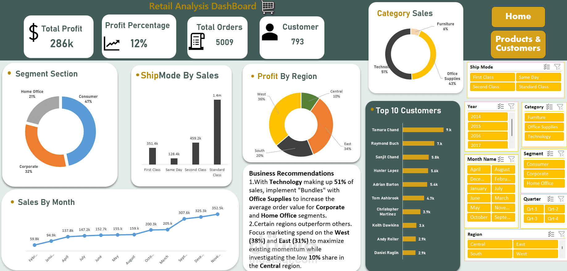 ولجعل هذه الرؤى متاحة وقابلة للتنفيذ، صممتُ لوحة تحكم تفاعلية تتضمن بطاقات مؤشرات أداء رئيسية ديناميكية للمراقبة الآنية لإجمالي الربح، ونسبة الربح، وإجمالي الطلبات، وإجمالي العملاء. باستخدام الجداول المحورية وتقنيات الرسوم البيانية المتقدمة، حوّلتُ بيانات البيع بالتجزئة المعقدة إلى رسومات بيانية واضحة وسهلة الفهم للمديرين التنفيذيين، موزعة على ثلاث صفحات رئيسية تغطي أقسام المنزل والمبيعات والمنتجات والعملاء.