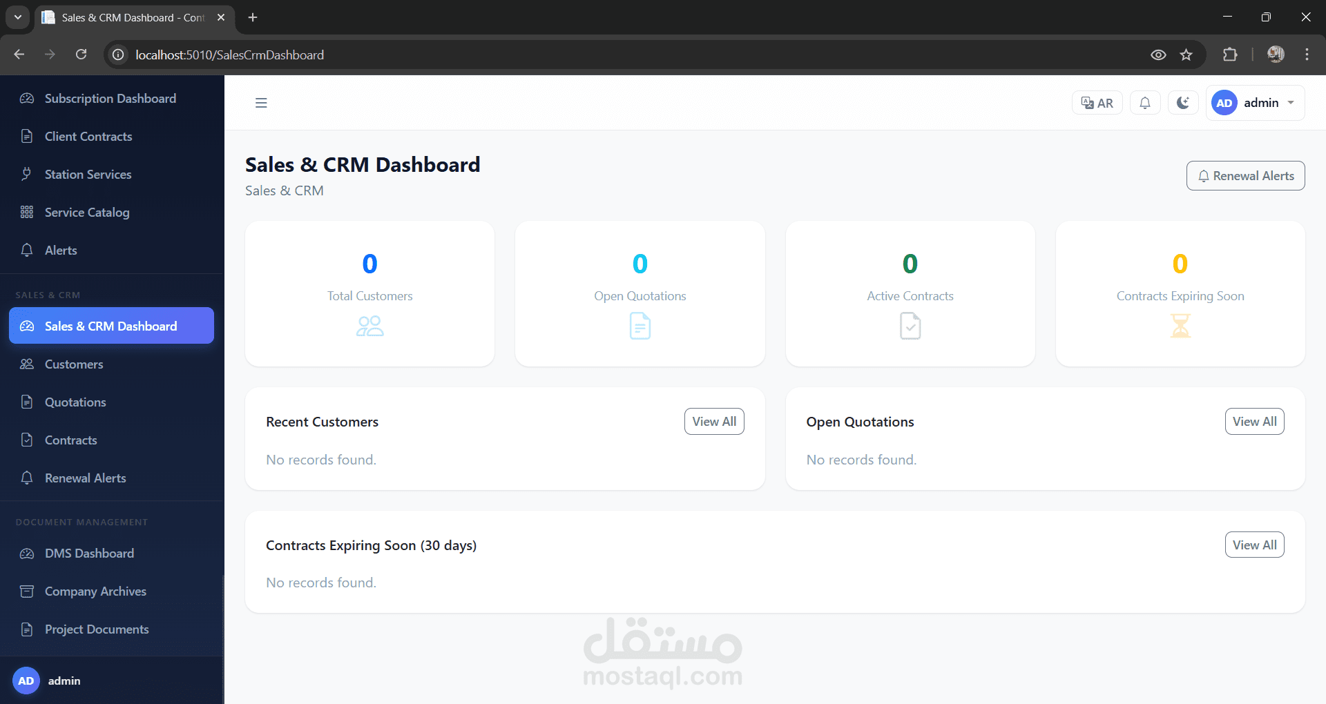 CRM تتبع العملاء، العقود، التجديدات، التنبيهات