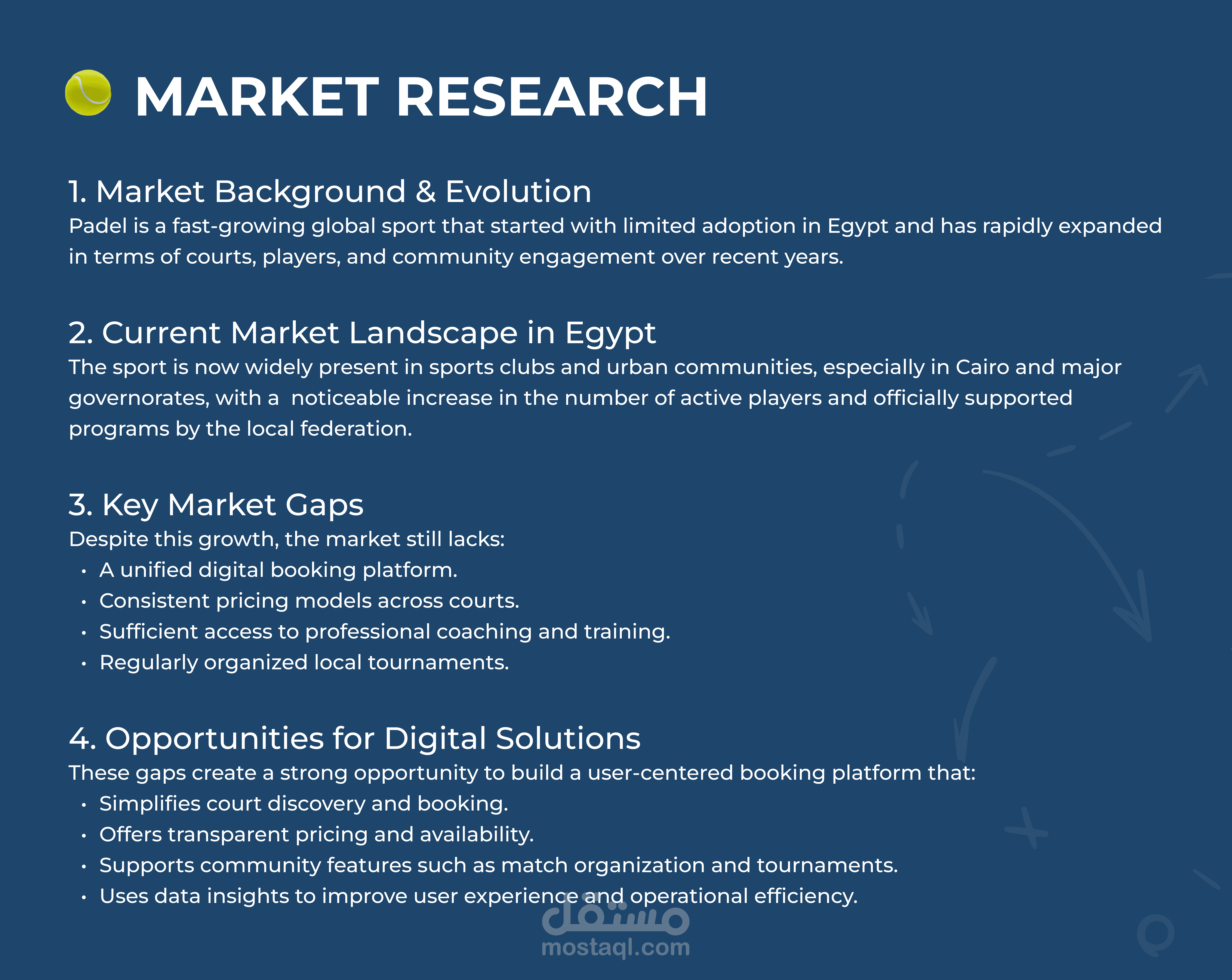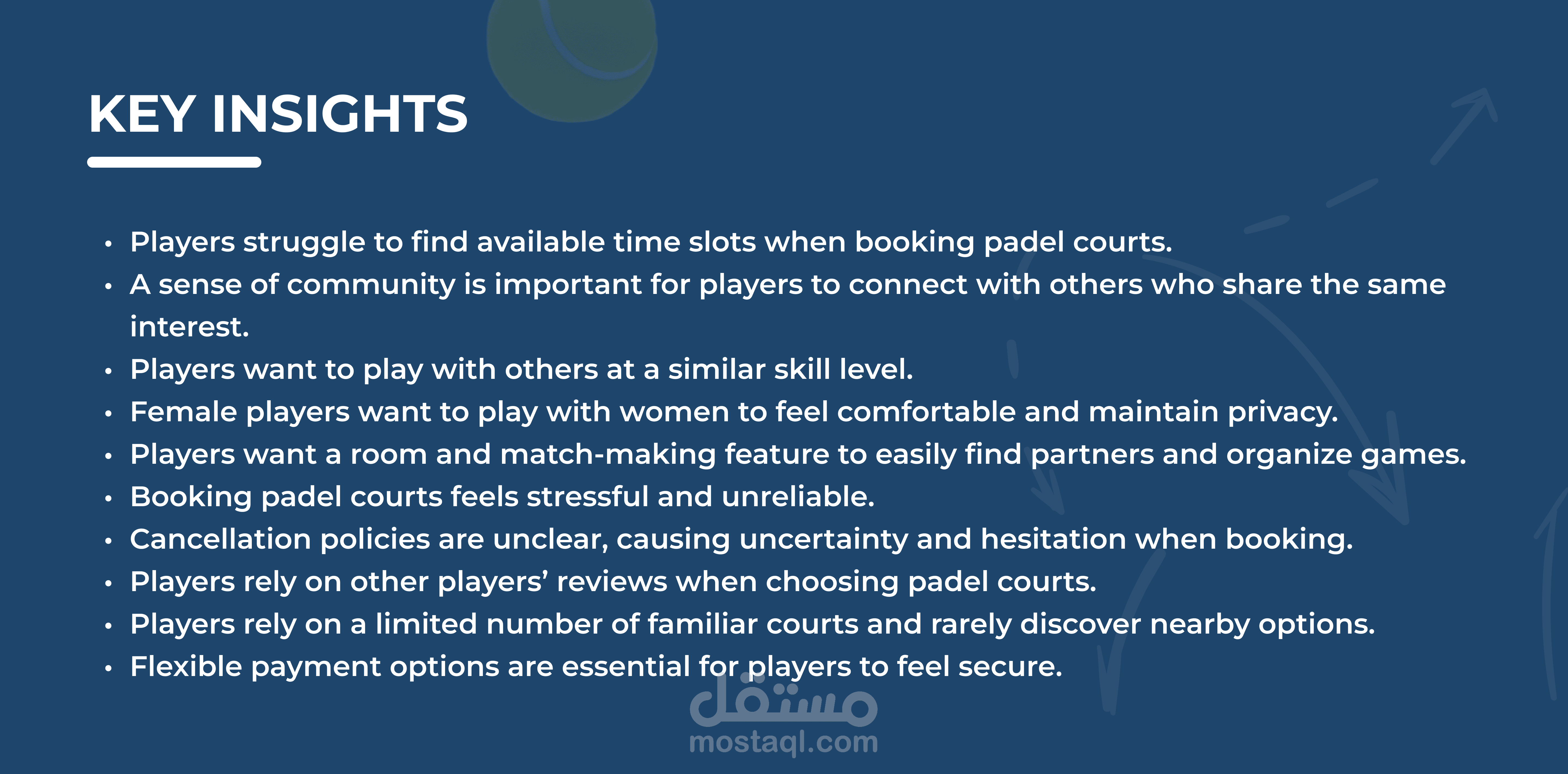 1. بحث المستخدم (User Research): تحديد التحديات التي يواجهها اللاعبون عند حجز الملاعب والتفاعل داخل المجتمع.