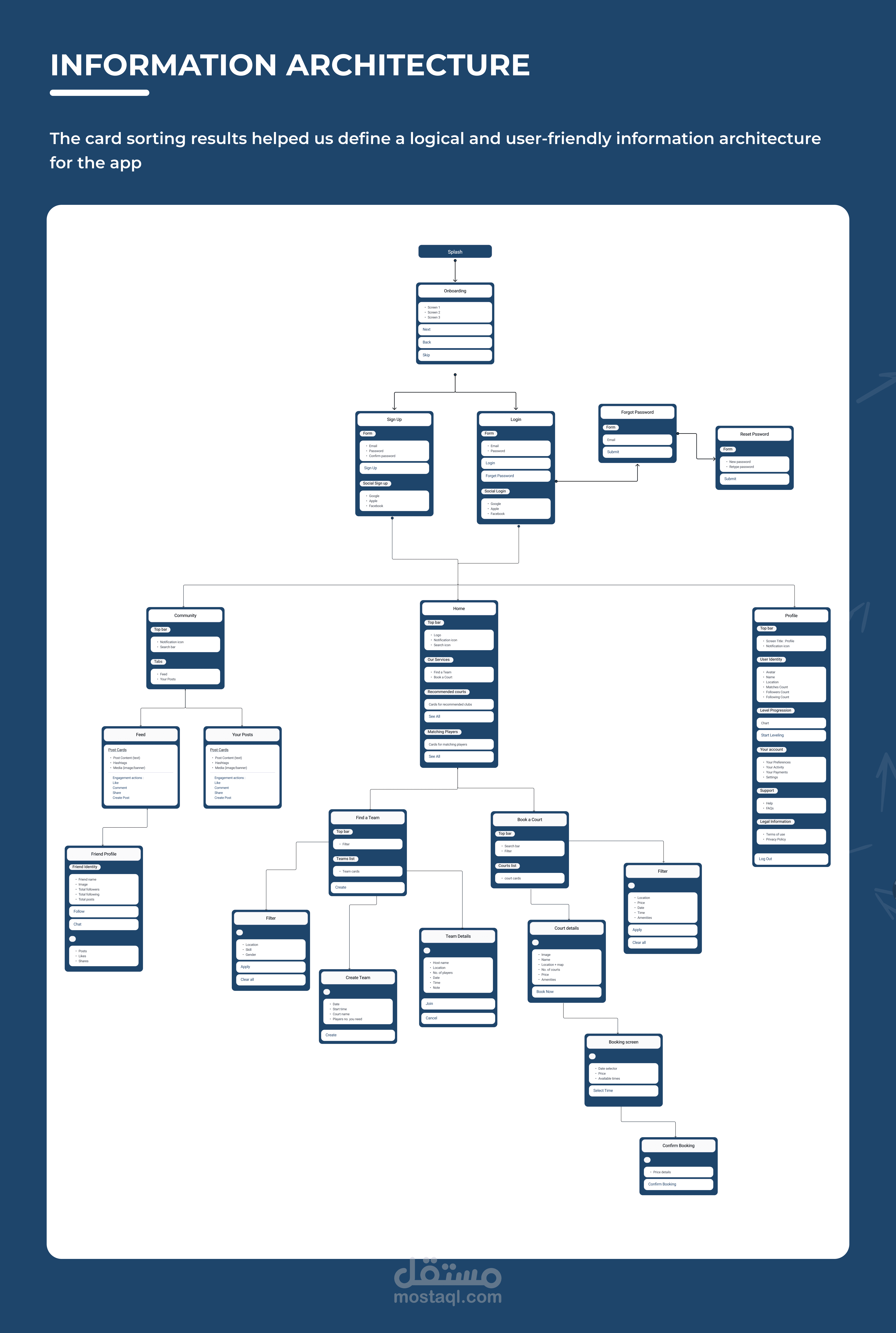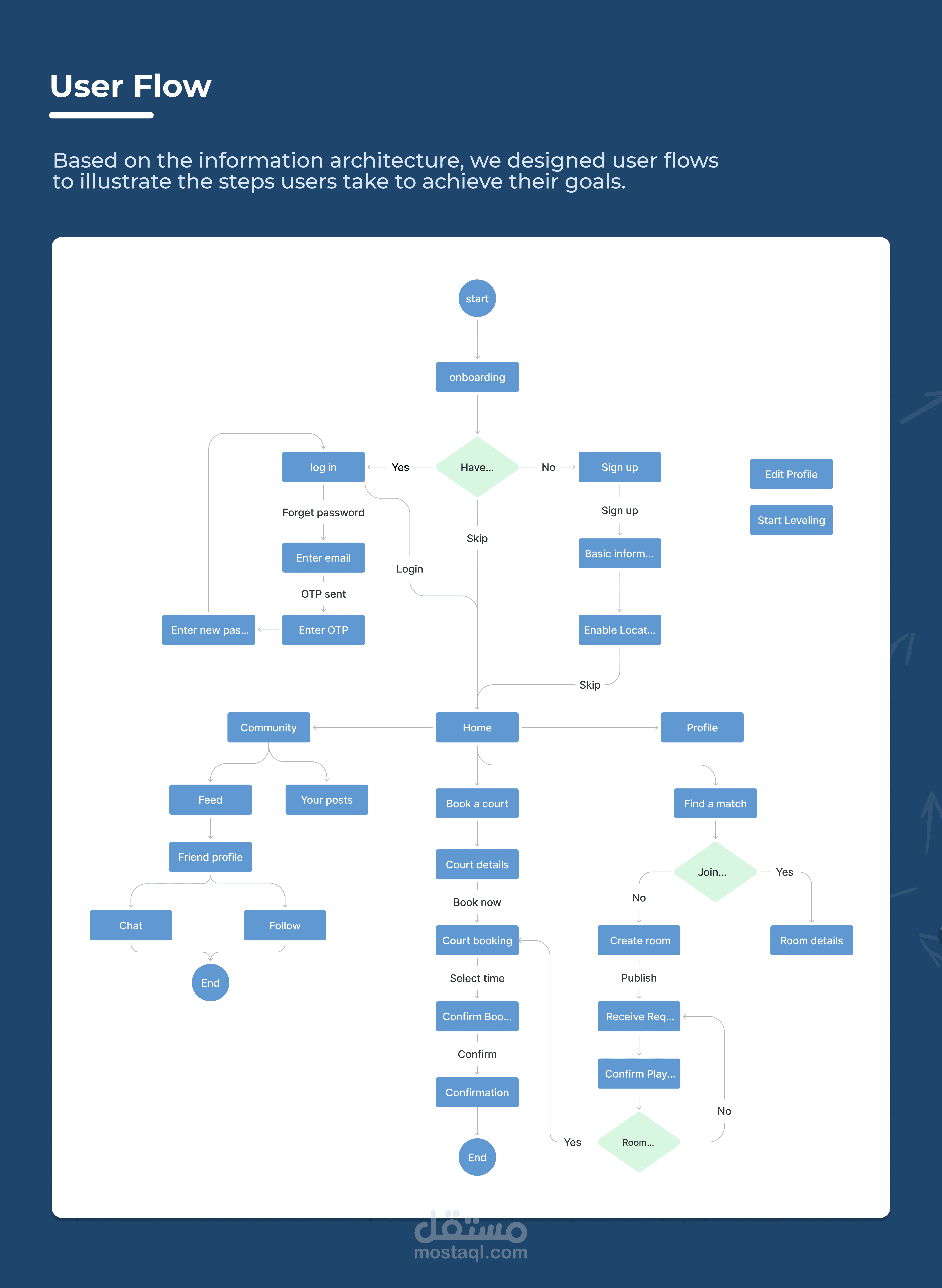 2. تحديد رحلة المستخدم (User Journey): من البحث عن ملعب حتى تأكيد الحجز والانضمام للرومات.