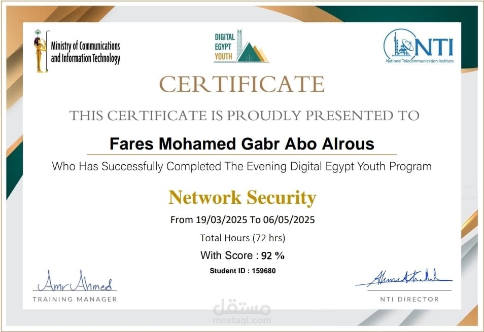 Successfully completed the Network Security training program offered by the National Telecommunication Institute (NTI) under the Digital Egypt Youth initiative, organized by the Ministry of Communications and Information Technology (MCIT), Egypt.