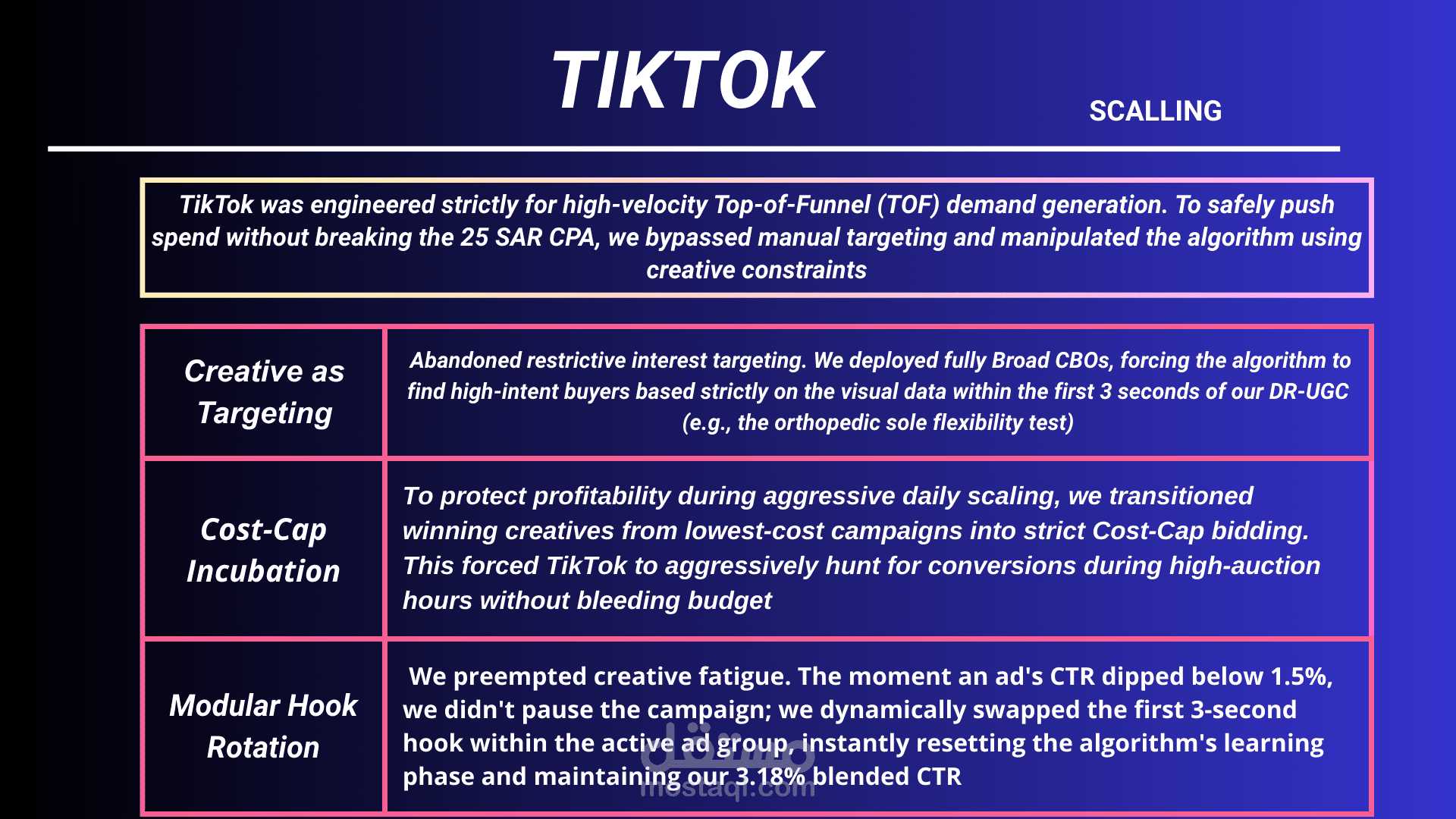 • Transitioned winning creatives into strict Cost-Cap bidding on TikTok to protect profitability during aggressive scaling