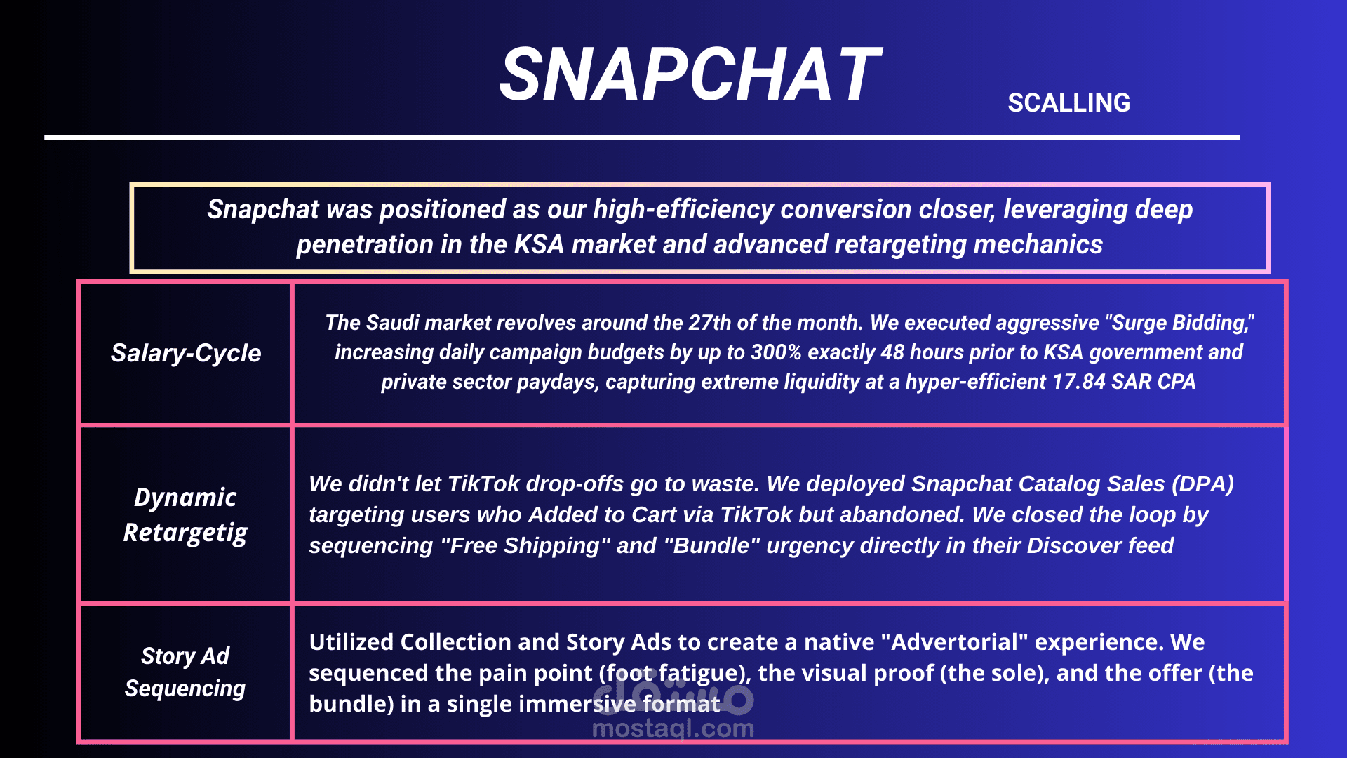 • Executed Snapchat "Salary-Cycle Surge Injections," increasing budgets by up to 300% exactly 48 hours prior to KSA paydays
